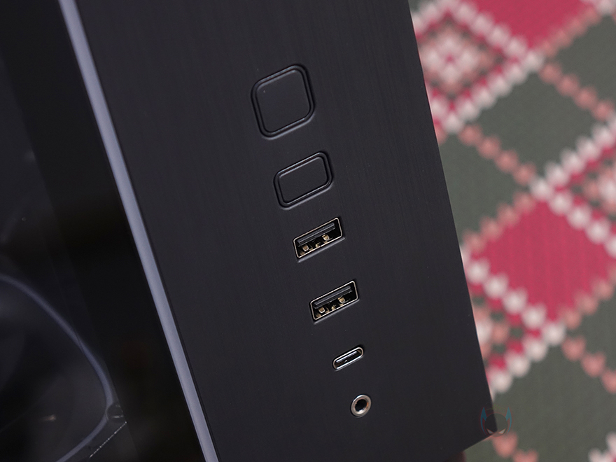 그럼, 본격적으로 마이크로닉스의 위즈맥스 스텔라 PC케이스 외형부터 살펴보는데, 색상은 블랙 1가지로만 출시되었습니다. 좀 더 정확히 언급하자면, 사실 위즈맥스 스텔라는 마이크로닉스에서 정식 수입 맡고 있는 겜디아스(GAMDIAS)의 PC케이스로 ATLAS M4 모델을 국내버전으로 출시한 거죠. 그래서, 색상은 블랙 1가지만 존재합니다. 전체적인 블랙 색상에 맞춰서 전면과 측면 강화유리 부분 역시 스모크 유리를 사용했으며, 미들타워지만 컴팩트한 사이즈 가졌고, 듀얼챔버 구조임에도 케이스 폭이 일반 미들타워 폭 수준의 235mm를 가졌죠. 그 이유는 뒤에서 하나씩 확인할 수 있습니다. 좀 더 부위별로 살펴보면, 전면은 강화유리 패널과 메탈릭 느낌의 헤어라인 디자인이 적용된 플라스틱 재질의 일반 패널이 적용되어 있으며, 두 패널 사이에는 뒤에서 확인하겠지만 RGB 라이트닝 효과를 볼 수 있는 바(Bar)가 적용되어 있습니다. 그리고, 일반 패널 쪽 아래에는 버튼 및 포트가 배치되어 있는데, 위에서부터 전원버튼, LED 버튼, USB 3.0 포트 2개, USB-C 포트, 오디오 포트순이죠.