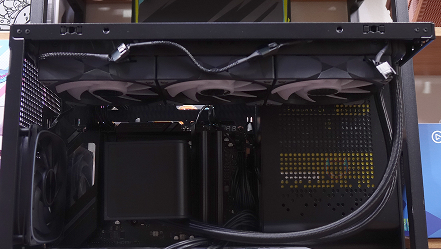 위즈맥스 스텔라 PC케이스를 사용해 시스템 조립을 해보면, 블랙 색상으로만 출시되었기 때문에 최대한 블랙 콘셉트로 조립을 해볼 텐데, 그전에 앞서 확인했듯이 백-커넥터 메인보드 장착 지원을 합니다. 그래서, 실제 백-커넥터 메인보드를 장착해 보면 후면에 배치된 메인보드 커넥터들이 홀을 완벽하게 통과하는 걸 확인할 수 있죠. 다시 본론으로 돌아와 블랙 콘센트로 최대한 맞춰 조립한 결과, CPU 쿨러 같은 경우에는 공랭 타워형 쿨러 장착시에는 최대 높이 175mm를 지원하며, 필자는 수냉 쿨러를 장착했기때문에 상단에 장착할 수 있는 최대 라디에이터 사이즈 360mm를 장착했습니다. 그리고, 그래픽카드는 최대 425mm를 지원해서 사실상 시중에 판매되는 그래픽카드는 간섭없이 모두 장착이 가능하며, 파워서플라이 같은경우에는 후면에 장착되는 듀얼 챔버 구조지만, 전면 앞자리에 장착됩니다. 앞자리에 장착되기 때문에 파워서플라이 깊이를 짧을수록, 그리고 모듈러 방식일수록 케이블 정리가 수월하고, 같은 위치 아랫 공간이 메인 케이블정리 공간임으로 최대한 활용을 해야 메인보드 트레이 후면 공간에 케이블정리 시 어려움이 없습니다. 물론, 전면 앞자리에 장착되기때문에 파워서플라이를 장착할 때 꼭 상단에 전원 연장선 연결은 필수죠.