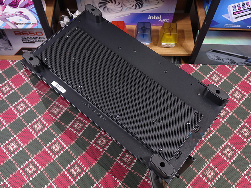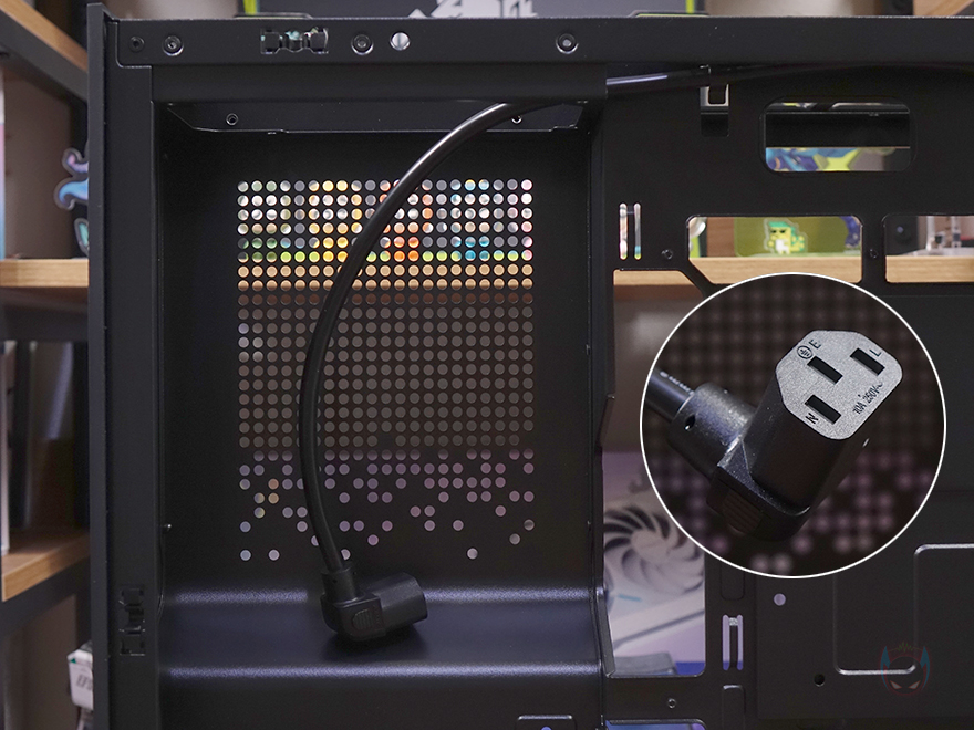 케이스 후면에는 배기역할로 타공망 디자인과 함께 내부에 120mm 팬이 기본 장착된 걸 미리 확인할 수 있으며, 140mm 팬으로도 장착할 수 있게 나사홀이 처리되어 있습니다. 또한, 팬 윗부분 내부 상단 공간만큼의 여백자리에는 타공망 처리를 해놨고, 같은 위치 맨 왼쪽에는 파워서플라이가 전면에 배치되기 때문에 전원 연장선이 추가로 적용된 걸 확인할 수 있죠. PCI 슬롯은 미들타워 기준인 7개를 갖추고 있으며, 같은 위치 맨 왼쪽에는 케이블 정리를 할 수 있는 홀더 걸이를 적용해 놨습니다. 외형 끝으로, 케이스 밑바닥 부분을 살펴보면, 받침대를 제외한 내부 하단 쿨링시스템 부분에 별도의 메쉬망을 적용했습니다. 특히 케이스 밑바닥보다 약 15mm 돌출된 내부에서 보면 매립 형태로 적용했는데, 왜 매립형태로 적용했는지는 뒤에 내부에서 확인할 수 있습니다. 물론, 내부에는 팬도 기본 장착되어 있죠. 참고로, 바깥쪽과 안쪽 메쉬망 주변에 있는 나사들을 풀면 분리가 가능합니다. 그리고, 케이스 받침대는 약 26mm 높이로 미끄럼방지 및 진동소음 최소화를 위해 패드도 기본 부착되어 있습니다.