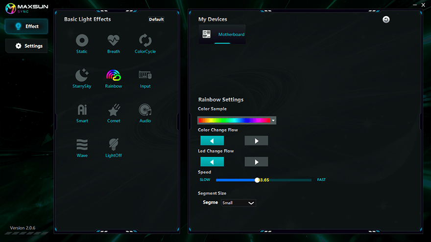 직접, 맥선(MAXSUN) iCraft B850 AIGA 메인보드로 PC시스템 구성을 갖춰 사용해 보면, 일단 전원이 들어오는 동시에 앞서 확인한 전원부 방열판의 시그니처 Skylight RGB 라이트닝 효과를 바로 확인할 수 있습니다. 그리고, 그래픽카드 탈거 장치인 퀵-릴리즈 위치에도 5개의 RGB LED가 점등되는 걸 확인할 수 있죠. 물론, 라이트닝 효과는 소프트웨어 지원으로 다양한 모드로도 전환할 수 있는데, 맥선 홈페이지에서 MAXSUNSync 프로그램을 다운로드하여 사용하면 됩니다. 총 11가지 모드에 색상 변경이나 속도조절 등 사용자가 원하는 대로 변경할 수 있죠.