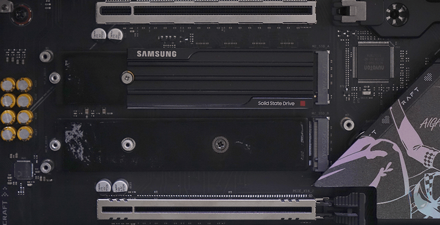 PCIE 슬롯은 총 3개를 갖추고 있으며, 1번 PCIE 슬롯 주변에는 부팅 시 그래픽카드 인식상태를 체크하는 LED가 배치되어 있습니다. 그래픽카드를 장착할 수 있는 1번과 2번 슬롯은 모두 스틸 아머 디자인까지 적용해 내구성을 갖추었고, 1번 슬롯은 PCIe 5.0x16배속, 2번 슬롯은 PCIe 5.0x8배속, 맨 아래 3번 슬롯은 PCIe 3.0x1배속을 적용했습니다. 또한, 그래픽카드가 주로 장착되는 1번 슬롯에는 탈거를 쉽게 할 수 있게 퀵-릴리즈(Quick-release) 장치가 적용되었으며, 1번과 2번 슬롯 사이에 장착된 방열판을 제거하면 M.2 SSD 슬롯 1번과 2번을 확인할 수 있습니다. 1번과 2번 M.2 SSD 슬롯 모두 PCIe 5.0x4 규격을 지원하고, 아래와 방열판 안쪽에 써멀패드도 기본 부착된 걸 확인할 수 있죠. 참고로, 1번 슬롯은 2242/2280 길이를 장착할 수 있고, 2번 슬롯은 2242/2280/22110 길이까지 장착할 수 있습니다. 그리고, 2번 슬롯 아래에도 방열판이 장착되어 있는데, 역시 분리하면 추가 M.2 SSD 슬롯으로 3번과 4번 2개 더 확인할 수 있으며, 두 슬롯 모두 PCIe 4.0x4 규격이며, 2242/2280/22110 길이까지 장착할 수 있고, 방열판 안쪽에 역시 써멀패드가 기본 부착되어 있습니다.