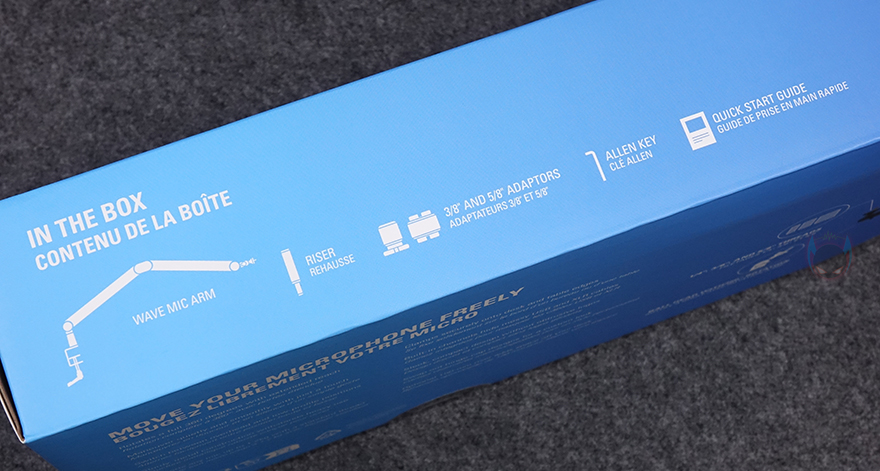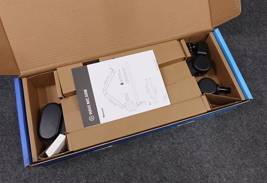 박스 오픈부분에는 엘가토 로고표시의 씰(seal)이 부착되어 있으며, 박스를 열어보면 구성품별로 나뉘어서 수납 포장된 걸 확인할 수 있습니다. 전체 제품 구성에는 웨이브 마이크암 MK.2, 케이블 커버, 라이저, 클램프, 3/8인치와 5/8인치 어댑터, 렌치, 설치가이드로 이루어져 있으며, 설치가이드에는 한국어도 포함되어 있습니다.