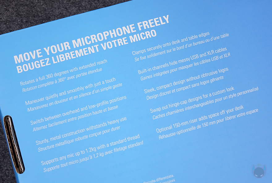 제품박스에는 제품 이미지를 담고 있어서 한눈에 마이크암 제품이라는걸 알 수 있으며, 제품 디자인도 간접적으로 미리 확인이 됩니다. 모델명과 함께 인기 있는 마이크 제품들의 호환성, 스튜디오 붐 암이라는 문구로 제품 콘셉트를 강조하고 있으며, 박스 한쪽 측면에는 제품의 구성품 목록과 사이즈 표기도 상세하게 담고 있죠. 박스 후면에는 제품의 주요 특징을 표기해 놨는데, 360˚ 회전부터 오버헤드와 로우 프로파일 높이 조절, 무게 하중, 마이크 케이블 수납, 힌지캡 디자인, 150mm 높이 라이저 등을 언급하고 있습니다. 바로 옆에 제품 이미지와 함께 주요 포인트로도 언급하고 있기 때문에 쉽게 이해가 되고, 뒤에서도 하나씩 살펴볼 때 다시 언급하겠습니다.