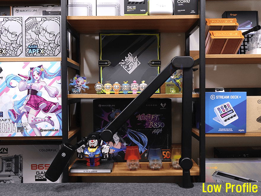 그럼, 웨이브 마이크암 MK.2를 오버헤드 또는 로우 프로파일 높이로 선택했을 때 가장 큰 이점은 무엇일까? 먼저 150mm 라이저를 사용해 오버헤드 높이로 사용하게 되면 데스크 공간이 협소한 경우에 모니터 후면에서 설치해 마이크를 앞으로 넘겨서도 자유롭게 움직일 수 있습니다. 특히, 이전 모델보다 길이가 더 길어졌기 때문에 좀 더 자유로워졌고, 수직 아래로 마이크를 배치할 수 있어서 목서리외에 키보드 타건이나 제품 언박싱 같은 주변 소음을 수음할 때도 마이크 위치 잡기가 유용하죠. 반대로 낮은 높이로 사용하는 로우 프로파일 같은 경우에는 개인공간 시 모니터에서 최대한 멀리 배치하거나 라이브 방송 같은 콘텐츠에서 최대한 길게 마이크를 배치할 때 유용합니다. 또한, 마이크를 세워서 사용하기에 편하기 때문에 토크 같은 목소리 수음에 편하다 할 수 있죠. 개인 환경에 따라서는 모니터 선반 사용 시 선반 아래 공간으로도 통과시킬 수 있지만, 클램프 높이가 77mm이기 때문에 최소 하단 공간 높이가 80mm 이상을 되어야 합니다. 이는 다른 로우 프로파일 마이크암을 사용할 때도 마찬가지죠. 필자 같은 경우에는 개인공간으로 사용하기 때문에 오버헤드가 더 편했습니다.