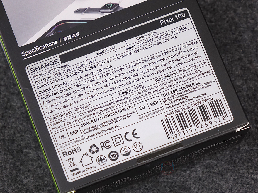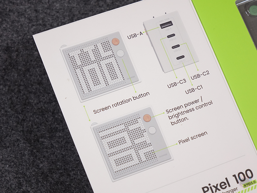 박스 한쪽 측면에는 주요 특징을 표기해놨는데, 픽셀 140과 동일한 특징으로 픽셀 디스플레이(Pixel display), 향상된 GaN 기술, 컴팩트한 크기, 접이식 플러그를 언급하고 있습니다. 박스 후면에는 연출 이미지와 함께 아래에는 제품의 기본 사양 표기를 확인할 수 있으며, 뒤에서 다시 확인하겠지만 총 4개의 충전포트를 갖추고 있기 때문에 포트별 충전속도를 상세히 표기해 놨죠. 박스를 열어보면, 역시 140W 모델과 동일한 포장방식을 적용했으며, 색상구분을 제외하면 제품 구성도 충전기와 제품설명서로 간단하고 동일합니다. 물론, 충전기에 종이포장이 씌워져 있기 때문에 사용 전에 벗겨야 하죠.