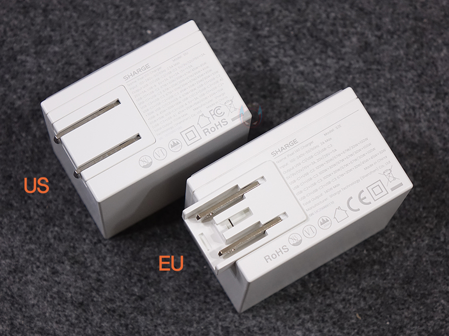 그리고, 앞선 시간에 먼저 만났던, 픽셀 140 모델과 비교해 보면, 크기 차이가 존재하며, 픽셀 100 충전기가 좀 더 작으면서, 충전 포트도 USB-A포트 1개, USB-C 포트 3개 총 4개로 1개 더 많습니다. 물론, 픽셀 140 모델은 PD 3.1 적용으로 최대 140W를 지원하고, 픽셀 100은 PD 3.0으로 최대 100W 충전속도를 지원하죠. 또한, 플러그 같은 경우에도 앞선 140W 모델에서 이미 언급했듯이 US와 EU 플러그 중 선택할 수 있으며, 둘 다 접이식이지만, EU 플러그 같은 경우에는 기본 제공되는 어댑터에 맞춰서 연결사용하는 거라 플러그위치 부분이 돌출형입니다. 반면에, US 플러그는 기본 110V 플러그에 맞춘 거라 돌출 없이 깔끔한 디자인을 가졌지만, 국내에서 220V로 사용하려면, 별도로 시중에 판매되는 일반 어댑터를 구매해서 사용해야 합니다. 이 부분은 뒤에 실사용 부분에서 다시 한번 언급하죠. 그리고, 플러그 위치부 옆에는 앞서 제품박스에서 확인했던 기본 사양 표기를 다시 한번 확인할 수 있습니다.