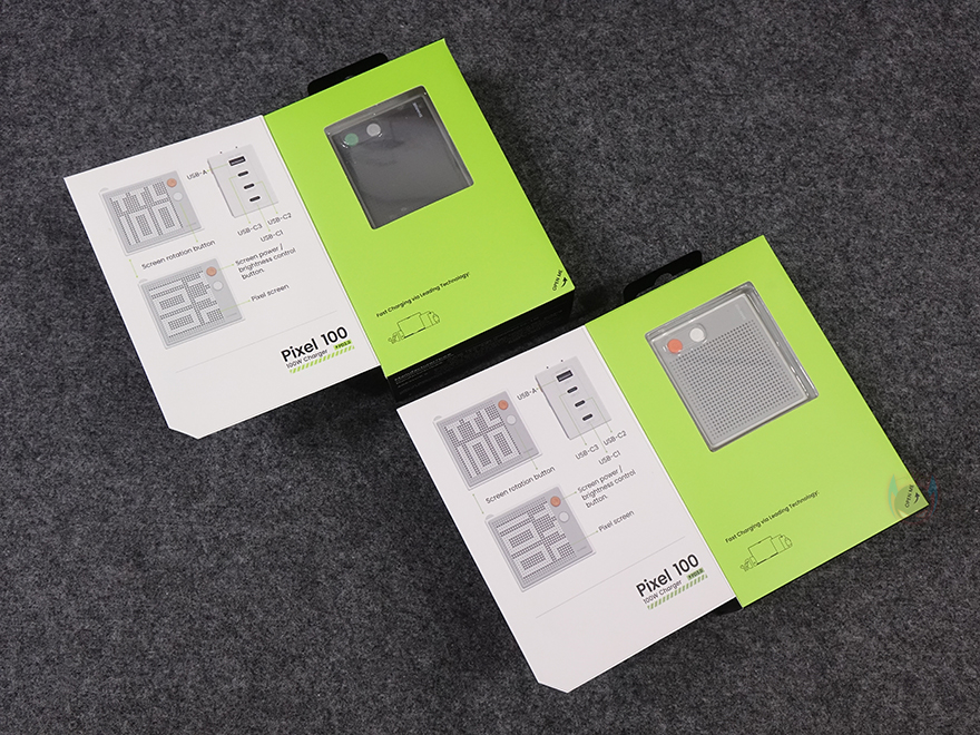 그럼, 본격적으로 SHARGE(샤지)의 픽셀 100 충전기를 살펴보면, 먼저 색상은 화이트와 그레이 2가지로 출시했습니다. 화이트와 그레이 색상 기준은 측면 픽셀 디스플레이를 제외한 나머지 다른 면에 색상에서 구분되죠. 그리고, 충전기의 핵심 특징인 측면에 적용된 픽셀 디스플레이(Pixel display)는 그레이 색상경우 블랙(Black) 색상을 적용했으며, 한쪽에 자리 잡고 있는 버튼 색상 역시 포인트로 화이트 모델과 다르게 전원버튼은 그린(Green), 방향전환 버튼은 그레이(Gray)로 적용했습니다. 물론, 뒤에서 확인하겠지만, LED 색상은 둘 다 화이트입니다.
