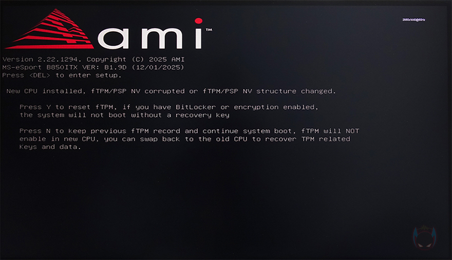 자동으로 시스템이 종료되면, 다시 PC를 부팅 시켰을 때 새로운 CPU 장착시 나오는 fTPM 선택화면이 나오는걸 확인할 수 있고, Y/N 선택 후 다시 재부팅이 된 후, Del키를 눌러서 바이오스 CMOS 화면으로 진입하면, e스포츠 B850ITX WIFI ICE 메인보드도 PMT 바이오스로 새롭게 바뀐걸 확인할 수 있다. 12월 1일자 이후에 올라오는 바이오스 업데이트 파일들은 모두 PMT 바이오스를 베이스로 하기때문에 12월 이전에 e스포츠 B850ITX WIFI ICE 메인보드를 구입한 사람이라면 꼭 업데이트하길 바란다.