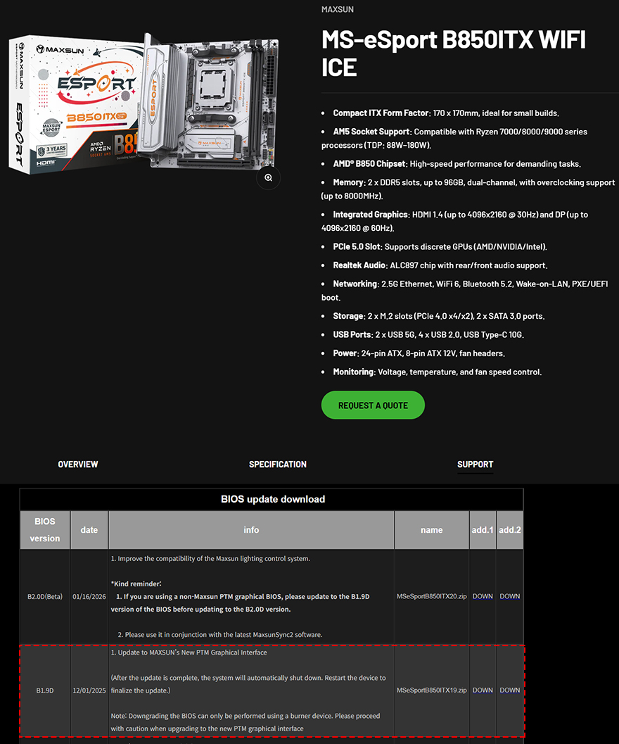 맥선 e스포츠 B850ITX WIFI ICE 메인보드 역시 이미 작년 12월 1일자로 PMT 바이오스 업데이트 파일이 홈페이지에 등록되었다. 따라서, 올해 구입한 소비자들은 이미 PMT가 적용된 상태일수도 있지만, 국내에서 작년 6월에 출시했기때문에, 작년 12월 전으로 구입한 소비자들은 PMT 바이오스 업데이트를 직접 진행하거나 공식수입사 및 구입했던 판매처에 요청을 해야한다. 직접 바이오스 업데이트를 하기위해서는 먼저 맥선 홈페이지에서 e스포츠 B850ITX WIFI ICE 모델에 등록된 12월 1일자 PMT 바이오스 파일(B1.9D) 다운로드 받는다. 다운로드 받은 파일은 압축 파일이기때문에 압축파일을 풀어서, FAT32 시스템포맷을 USB 메모리에 담는다. 꼭 USB 메모리를 FAT32로 포맷해야하며, 바이오스파일 외에 외부 파일은 USB 메모리에 담지 않는게 진행에 안정적이다.