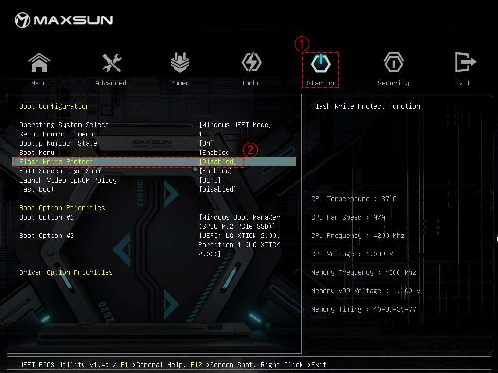 USB메모리에 PMT 바이오스 업데이트 파일은 담은 후에는 e스포츠 B850ITX WIFI ICE 메인보드 후면 백패널 I/O 포트에 있는 USB 포트에 꽂고, PC 전원 부팅과 함께 Del키를 눌러서 CMOS 화면으로 진입한다. 바이오스 CMOS 화면으로 진입되면, 상단 메뉴에 Startup 메뉴로 이동해 Flash Write Protect 옵션이 Disabled(비활성화)로 되어있는지 확인하고, 만약 Enabled(활성화) 되어있다면, 반드시 Disabled로 변경한 후, Exit 메뉴로 이동해 재부팅시 바이오스 파일이 담긴 USB로 부팅되게, Boot Override 메뉴에서 해당 USB 메모리를 선택한다. USB 메모리를 선택하면, 자동으로 재부팅이 되면서, EFI Shell 화면이 뜨는데, 아무 키 입력없이 그대로 놔두면 2~3초후에 알아서 업데이트를 자동으로 진행한다. 업데이트가 정상적으로 마무리되면, 자동으로 시스템 종료된다.