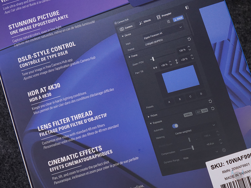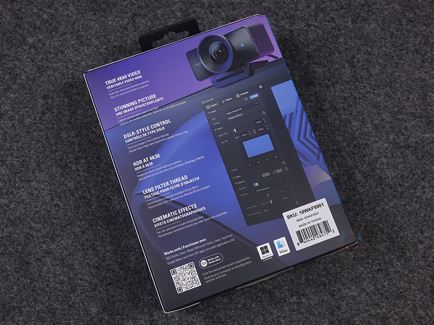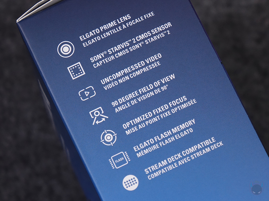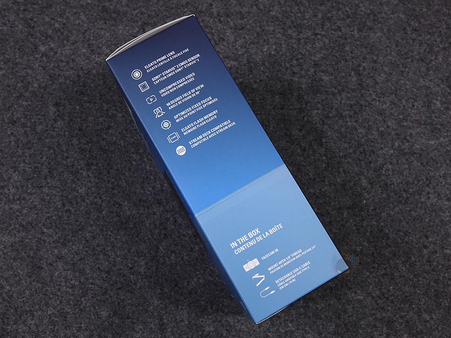 제품박스부터 살펴보면, 전면에는 모델명과 함께 제품 이미지를 담고 있어서 박스를 개봉하기 전에 미리 디자인을 확인할 수 있습니다. 전체적인 형태는 모니터 위에 장착하는 웹캠이지만, 카메라 부분이 마치 디지털카메라 렌즈처럼 보이는데, 바로 아래 제품 특징 문구에도 4K 60 프레임 지원, DSLR 같은 품질, 렌즈 필터를 언급하고 있죠. 박스 한쪽 측면에는 좀 더 자세하게 주요 특징을 언급하는데, 카메라 센서는 최근 차량 블랙박스 등의 보안카메라에서 고화질로 많이 사용되는 소니의 스타비스 2를 탑재했다는 걸 미리 알 수 있으며, 90도 화각, 최적화 고정초점, 플래시 메모리, 스트림덱 지원 등을 언급하고 있습니다. 그리고, 아래에는 제품 구성목록도 확인할 수 있죠.