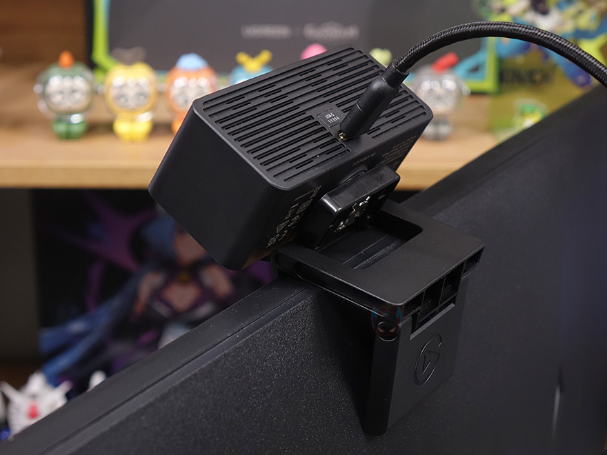 웹캠 상단에는 엘가토 로고를 음각으로 표현해 놨으며, 후면에는 내부 발열 배출을 위해 에어홀 디자인과 함께 USB 전원 포트를 확인할 수 있는데, USB-C 포트이며, 전력은 5V, 0.9A입니다. 그리고, 밑바닥 부분에는 중앙에 1/4인치 나사홀이 적용되어 있는데, 함께 제공되는 모니터 마운트나 별도의 삼각대 또는 붐 암 같은 거치대에도 연결할 수 있게 지원합니다. 모니터 마운트는 방금 확인한 웹캠 1/4인치 나사홀과 결합되는 볼트가 상단에 있으며, 거치 부분은 접이식으로 펼쳐서 모니터에 고정할 수 있는 방식으로 안쪽에 접지력을 위한 패드도 부착되어 있죠. 웹캠과 PC/노트북을 연결시켜 주는 USB 케이블은 총 2m 길이에 깔끔하게 전체 슬리빙 처리를 해놨으며, 양쪽 모두 USB-C 인터페이스로 USB 3.0을 지원합니다. 참고로 4K 60 프레임 지원은 USB 3.0 연결 시 지원됩니다.