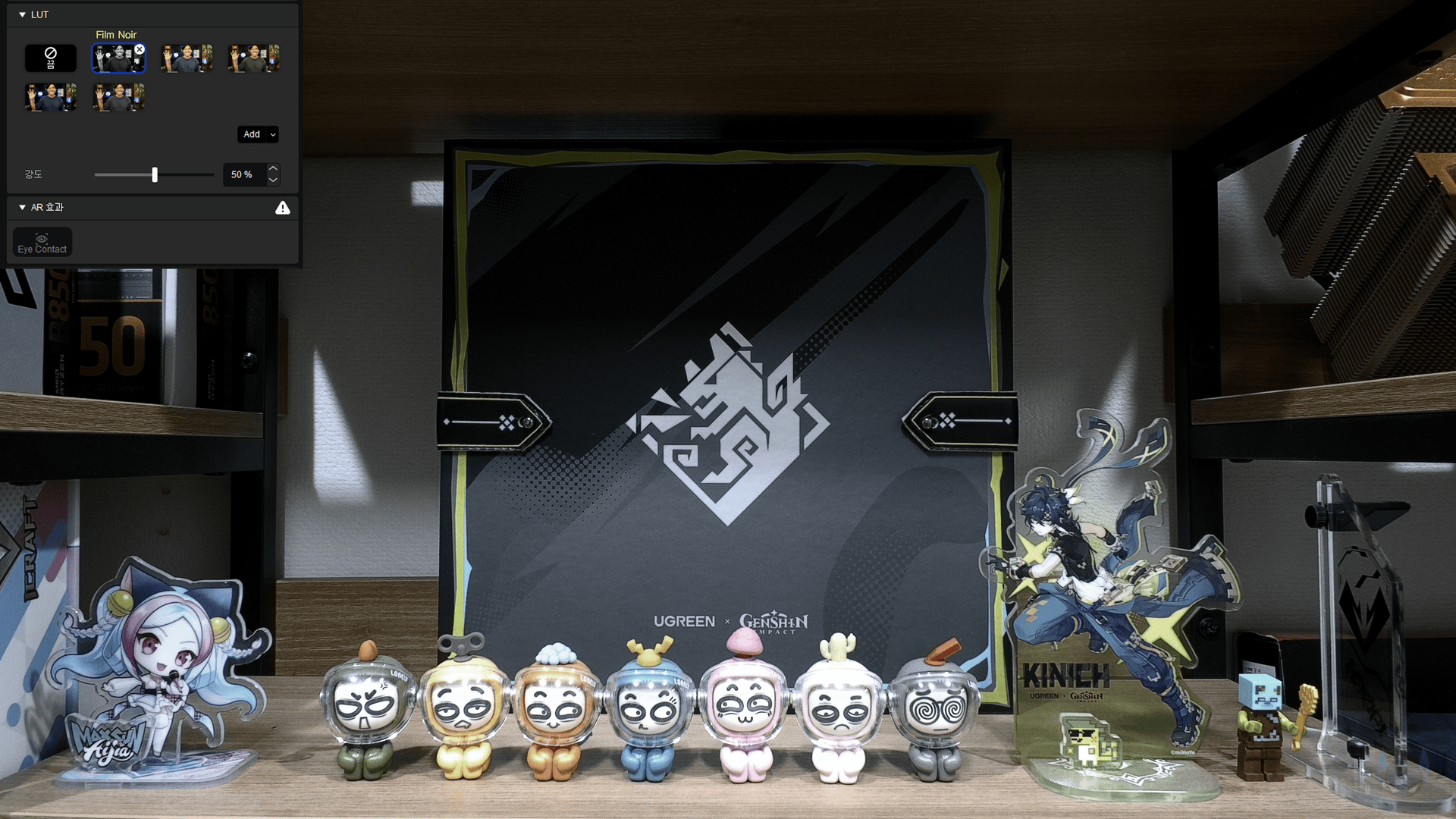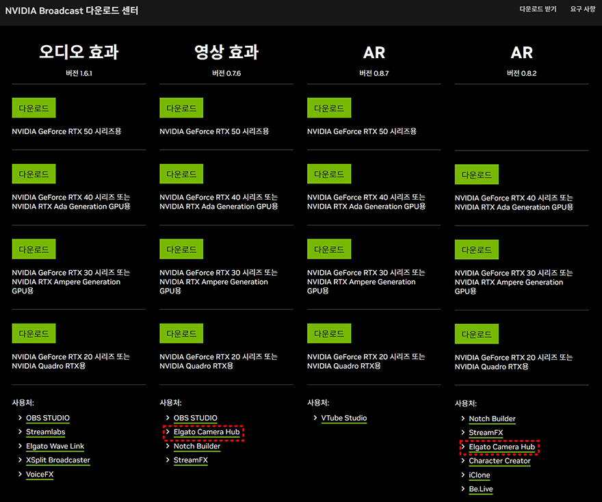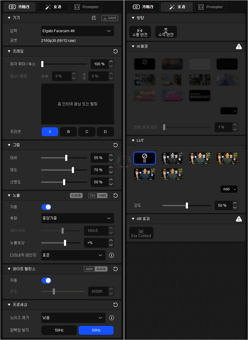 이번엔 효과 설정탭 메뉴를 살펴보는데, 효과설정은 말 그대로 카메라에 부가적인 효과를 적용하는 기능으로 흔히 동영상 편집 프로그램에서 다루는 효과들과 비슷하죠. 먼저, 웹캠을 직접 돌리지 않고도 수평/수직 화면 반전을 할 수 있습니다. 그리고, 분위기연출 효과의 LUT(Look-Up Table) 기능도 갖추고 있는데, 기본 5가지를 제공해주고 있죠. 이밖에도 Nvidia GPU기반의 그래픽카드를 사용하고 있다면, 추가로 AI 배경효과와 얼굴추적 기능도 사용할 수 있는데, Nvidia 홈페이지에서 영상과 AR SDK를 다운로드 받아 설치해야 기능이 활성화 됩니다.
