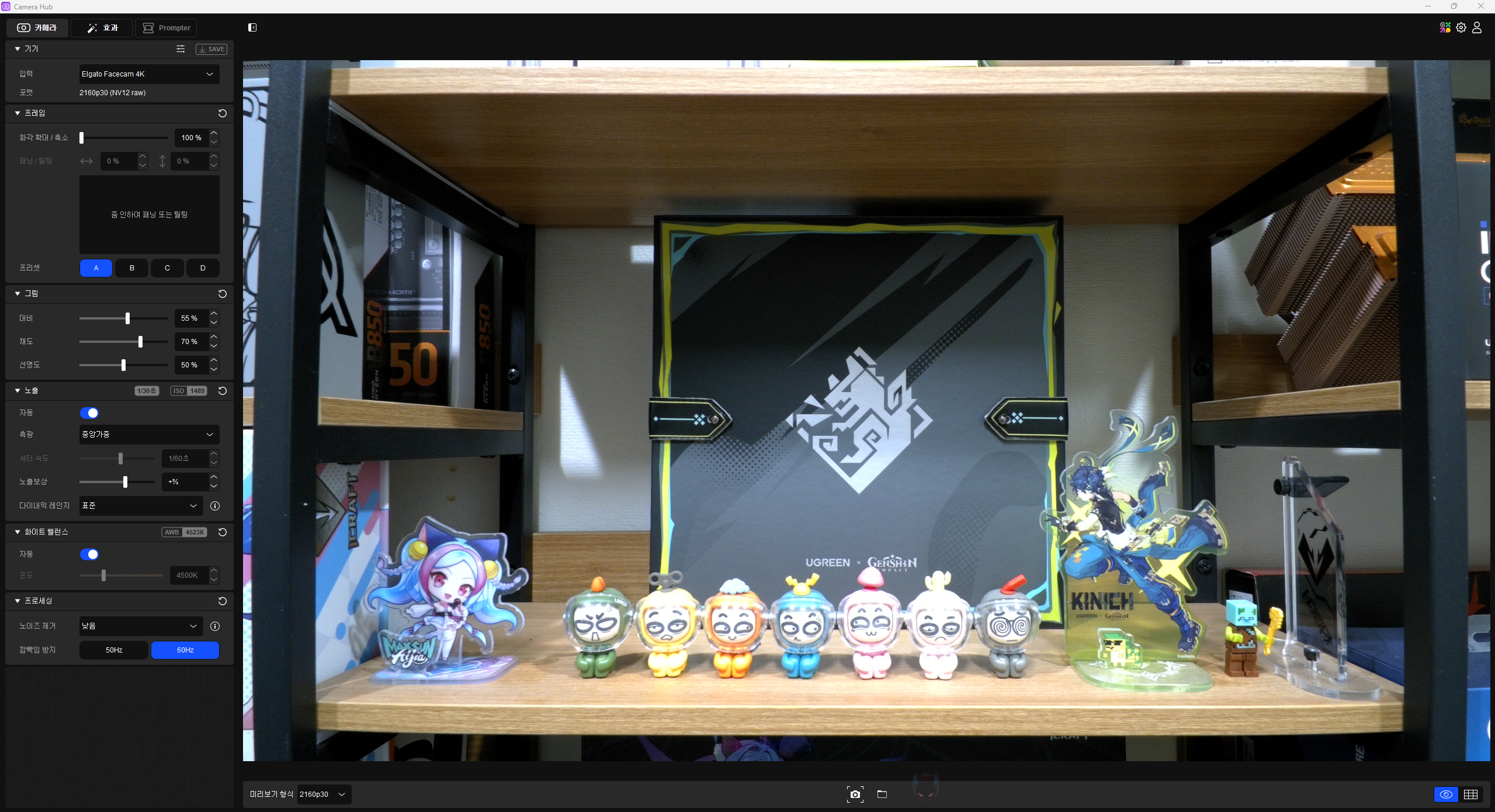 페이스캠 4K 웹캠 장착이 끝나면, 엘가토 홈페이지에서 전용 프로그램 CAMERA HUB를 다운로드 받아 설치해야 합니다. 프로그램이 설치되고, 실행되면 웹캠 인식과 함께 카메라가 켜지는데, 이때 카메라 오른쪽에 있는 LED도 점등되죠. 프로그램을 실행시켜 보면, 맨 왼쪽에는 설정 메뉴탭, 오른쪽에는 미리 보기 화면이 배치되어 있으며, 메뉴탭에는 카메라와 효과 설정으로 나뉘고, 자사의 프롬프터 장치를 함께 사용하면 추가로 프롬프터 메뉴탭도 활성화가 됩니다. 그리고, 앞서 언급했듯이 페이스캠 4K는 최대 4K 60 프레임을 지원하는데, USB 3.0 이상 연결 시 지원하며, 만약 USB 2.0으로 연결하면 풀-HD 60 프레임까지만 지원하고, 이 역시 카메라 설정 맨 위에 배치된 기기정보를 통해 쉽게 확인할 수 있으며, 미리 보기 선택 시에도 해당 지원 프레임까지만 표시되죠. 이밖에 미리 보기 화면에는 중앙 맨 아래에 캡처 기능과 캡처저장된 폴더 열기 버튼이 배치되어 있으며, 같은 맨 오른쪽에는 미리 보기 화면 On/Off, 격자(가이드라인) On/Off 기능이 있습니다.
