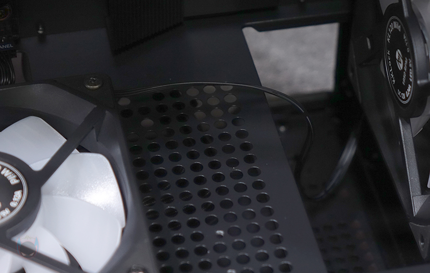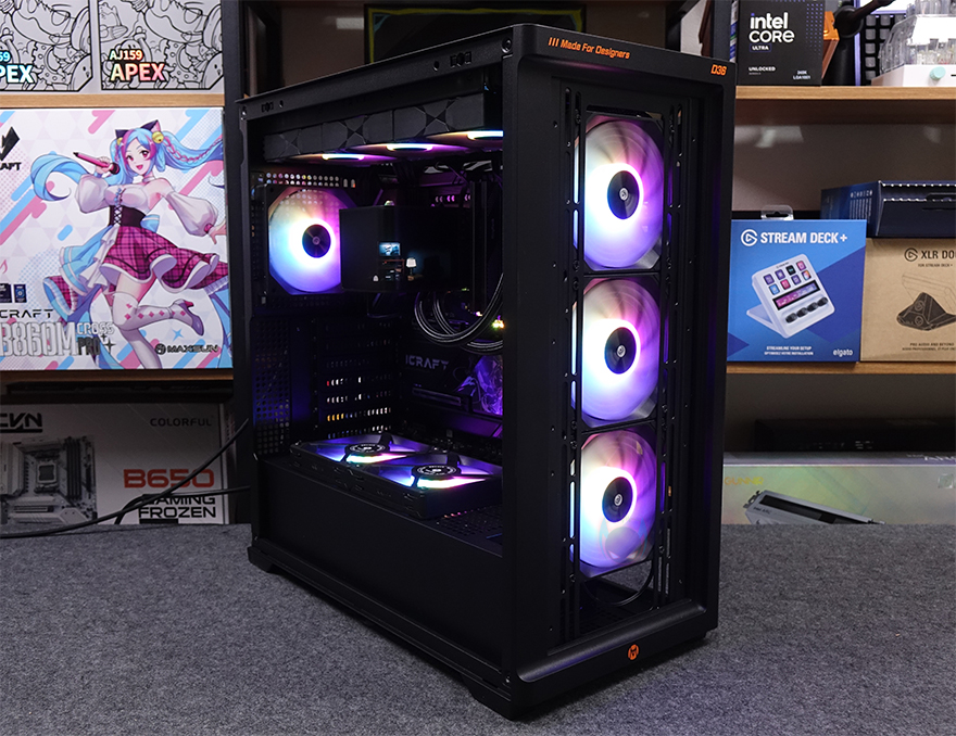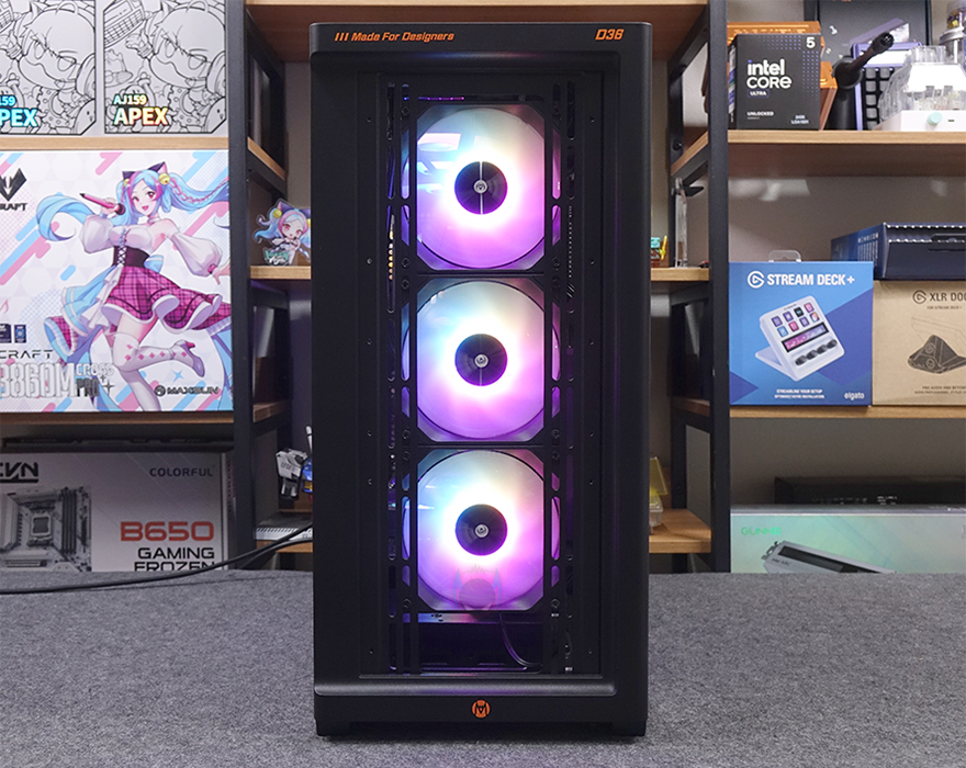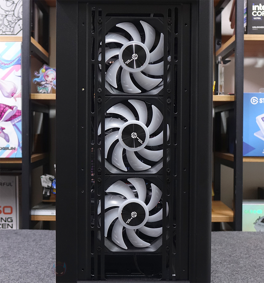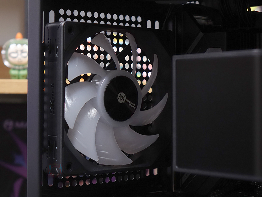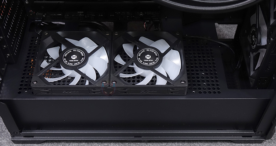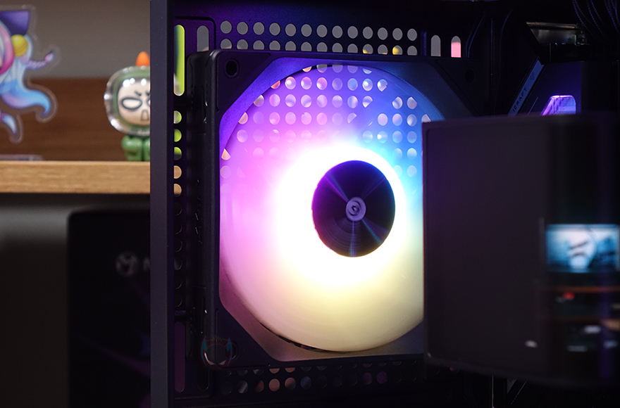 직접, Mechanic Master KL120 Wild 팬을 사용해 보는데, 앞선 시간에 만났던 자사의 D36 PC케이스 전면과 후면, 그리고 내부 하단에 총 6개의 KL120 Wild 팬을 장착했습니다. 전면과 하단은 거리가 있지만, KaKa link 연장선으로 연결시켜 주었죠. 팬 장착 후 시스템을 갖추고 메인보드에 정상적으로 연결되어 인식이 되면, 메인보드에서 지원하는 RGB Sync와 완벽하게 작동되는 걸 확인할 수 있습니다. 참고로, 최대 속도가 1950 RPM이기 때문에 환경에 따라서는 CPU쿨러의 팬 대체로도 가능합니다.