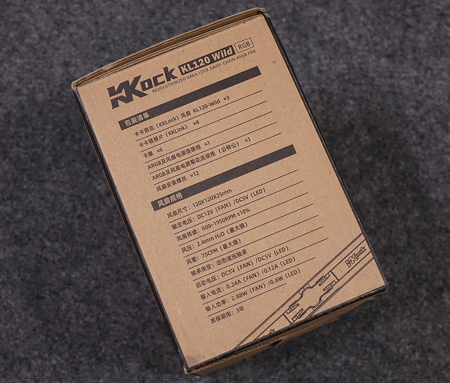 반대편 측면에는 제품의 구성 목록과 팬 성능에 대한 사양을 표기해 놨으며, 박스를 열어보면, 총 4개의 박스가 들어있는 걸 확인할 수 있습니다. 똑같은 크기의 3개 박스는 팬이 비닐포장과 함께 수납되어 있고, 나머지 박스는 구성품들이 들어있죠. 그래서, 전체 제품 구성은 KL120 Wild 팬 3개, 나사들, KaKa Link 피스 4개, KaKa Plug 6개, KaKa Link 연장선(extension cable), PWM/5v ARGB 케이블, 설명서로 이루어져 있습니다. 박스나 설명서 모두 중국어로 표기되어 있지만, 그림 이미지를 함께 담고 있고, 사용법이 쉽기 때문에 쉽게 이해가 됩니다.