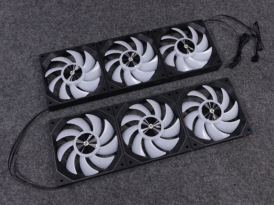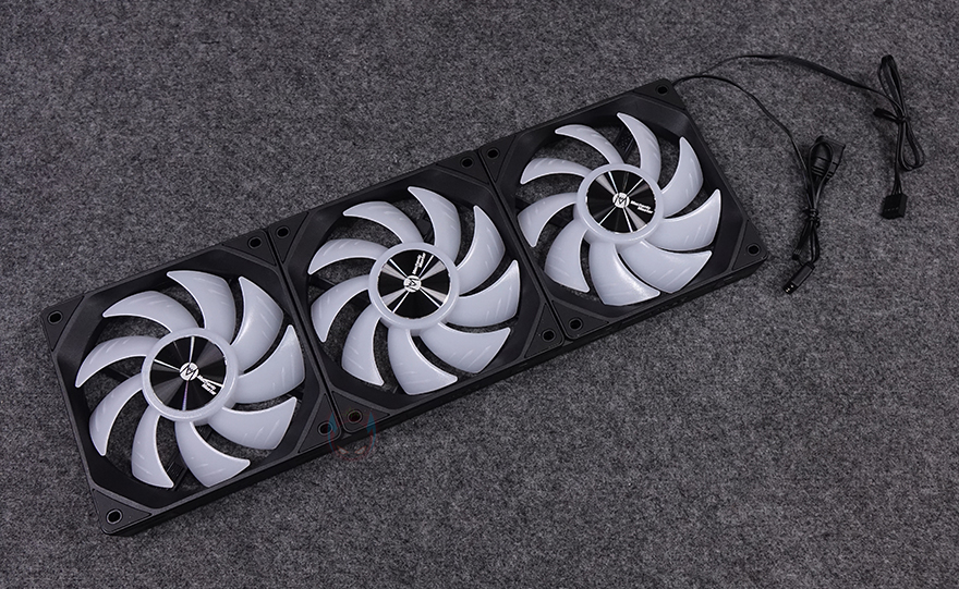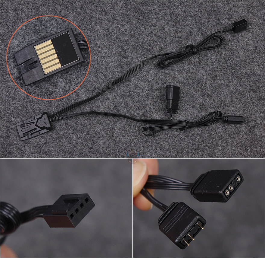 팬까지 서로 연결을 마치면, 마지막으로 팬 작동과 ARGB 연결을 메인보드와 연결시켜 주는 전원케이블을 팬 한쪽 포고핀 홈에 끼워주면 됩니다. 전원케이블에는 자동 속도조절의 4 pin PWM 방식이고, RGB는 5v ARGB로 메인보드 Sync와 연동해서 작동되도록 지원하고 있죠. 또한, 3 pin 5v ARGB 같은 경우 암수(Female/Male) 모두 적용해 팬이나 다른 장치의 ARGB와도 연결 연장할 수 있게 갖추고 있습니다. 끝으로, KaKa Link 피스와 같은 형태지만 케이블이 달린 연장선은 팬을 PC케이스 위치에 따라 거리가 있을 때 서로 연결시켜 줄 수 있습니다.