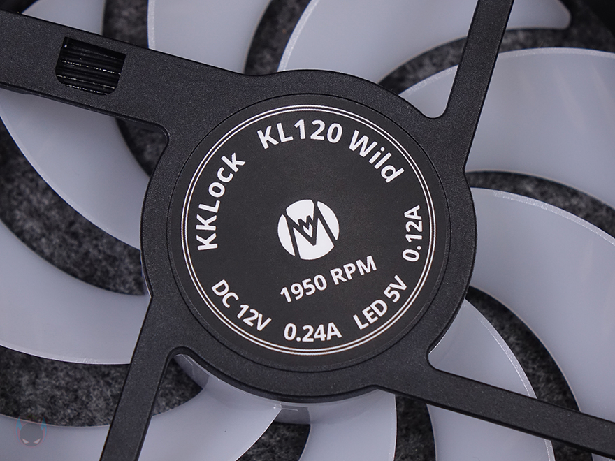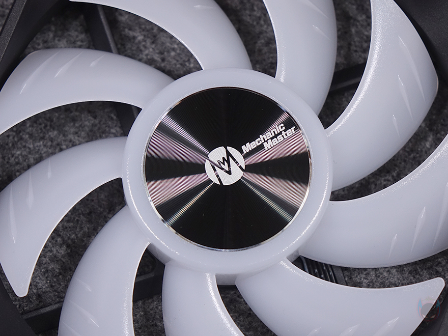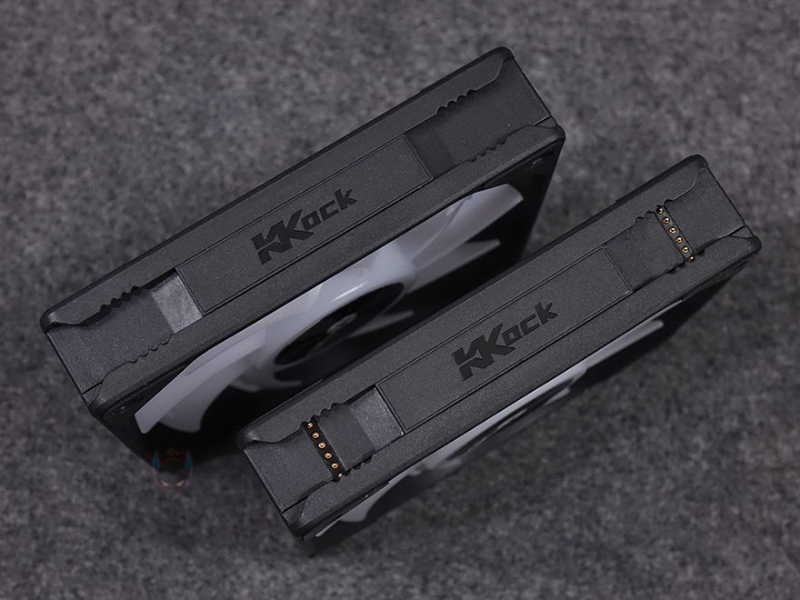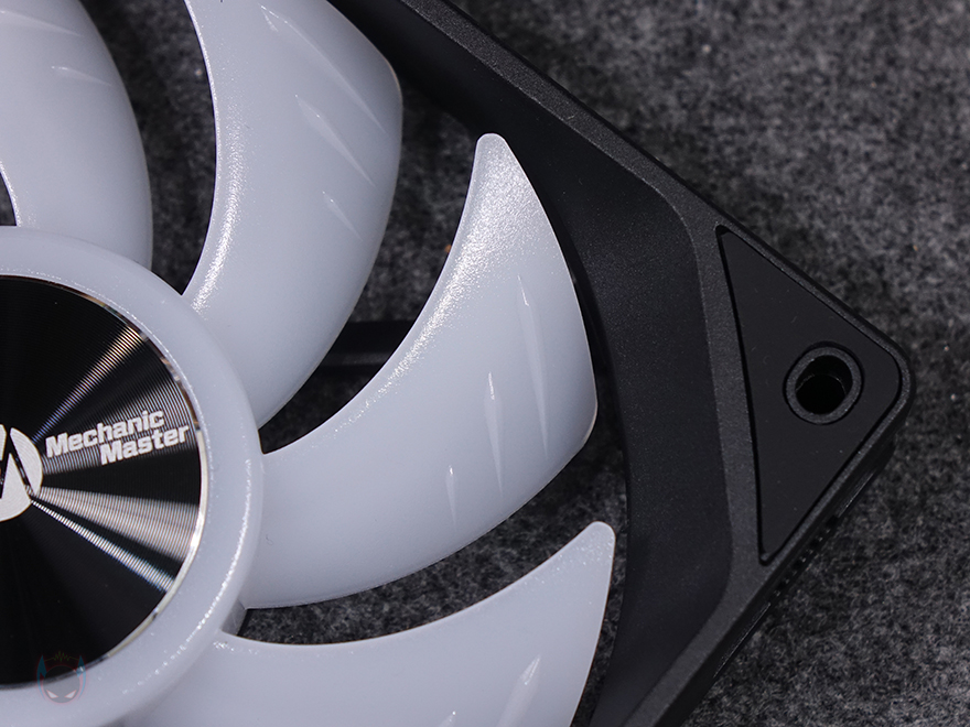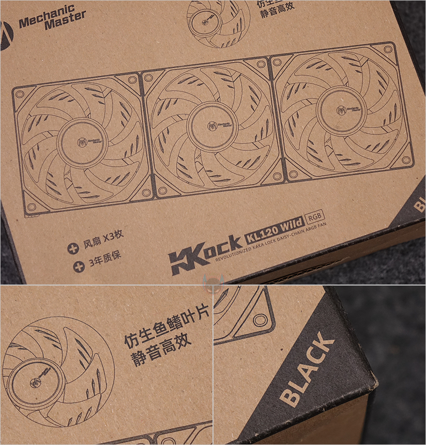 그럼, Mechanic Master(메카닉 마스터)의 KL120 Wild 팬을 살펴보면, 3 Pack 제품에는 당연히 팬 3개가 들어가 있고, 앞서 언급했듯이 구매 옵션에서 1개 구매도 가능하고, 블랙과 화이트 2가지 색상 중에 선택할 수 있습니다. 팬 크기는 전형적인 120x120x25mm 크기이며, 총 9개의 날개(Blade)를 갖추고 있으며, 중앙 베어링 부분은 알루미늄 재질에 로고 플레이트를 적용했습니다. 또한, 베어링은 최근 많이 사용하는 소음은 적고 긴 수명을 가진 HDB(Hydraulic Dynamic Bearing)을 적용해 베어링 면적이 넓은 것도 확인할 수 있죠. 날개 부분에는 풍량을 높이도록 많이 사용하고 있는 상어 지느러미 디자인(shark fin design)을 적용했습니다. 또한, 각 모서리 부분의 나사홀 주변에도 진동소음을 줄이도록 방진패드 디자인도 기본 적용되어 있죠. 팬 후면을 보면 데이지체인 방식이라 케이블이 없는 것을 확인할 수 있고, 중앙에 팬 최대 RPM속도를 표기해 놨습니다. 팬 측면 두께는 25mm로 KaKa Link와 Plug가 연결되는 측면은 연결 홈과 중앙에 KaKa Lock 로고를 새겨놨습니다. 연결 홈은 한쪽 측면에는 포고핀, 반대편에는 그냥 홈만 적용된 형태죠.