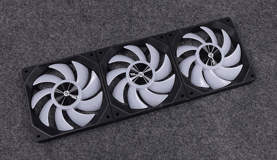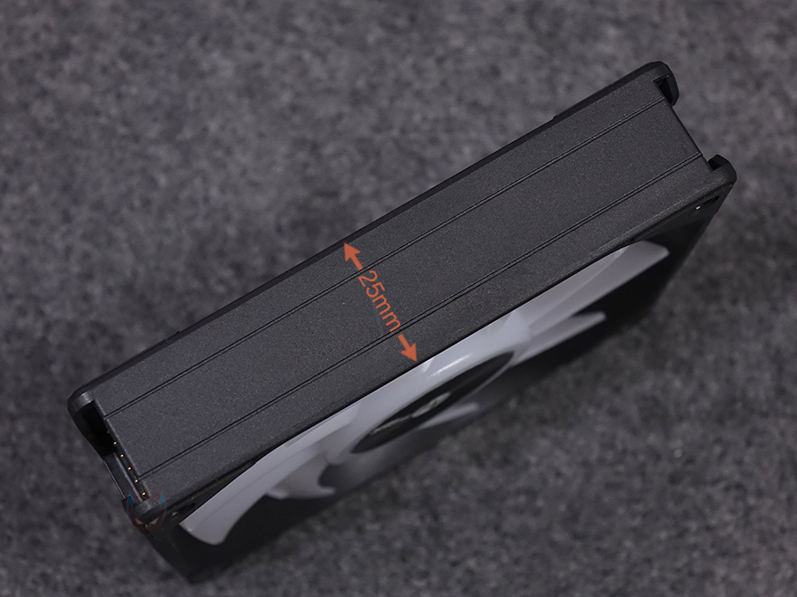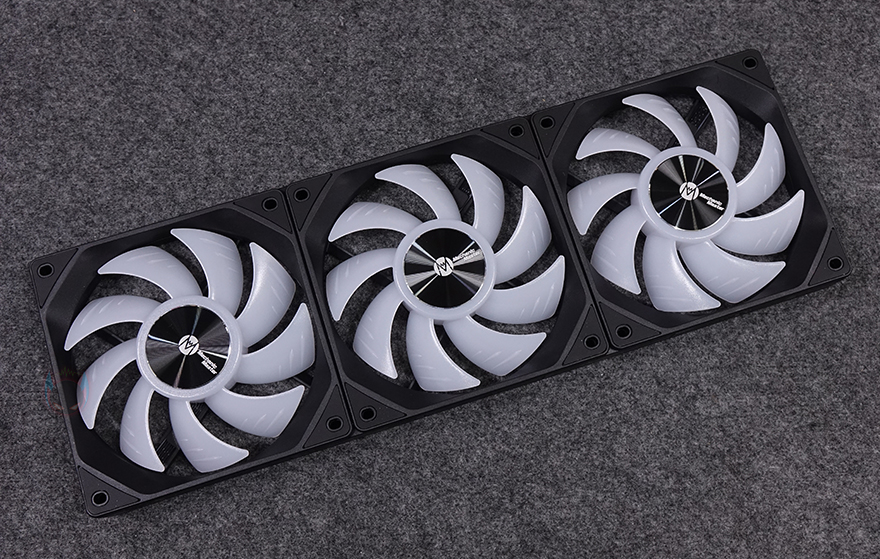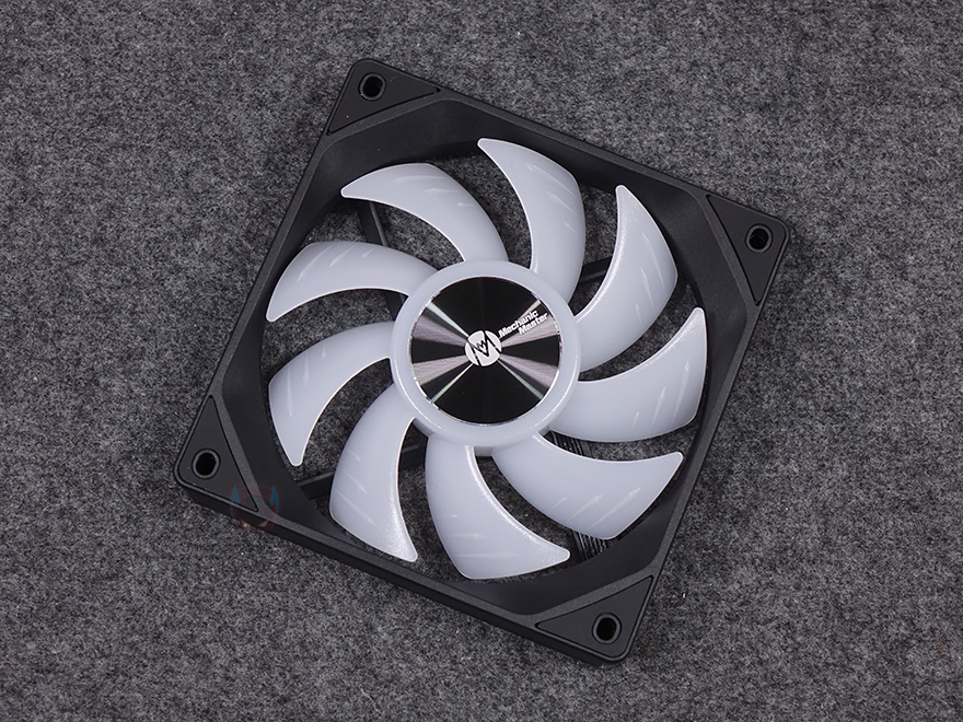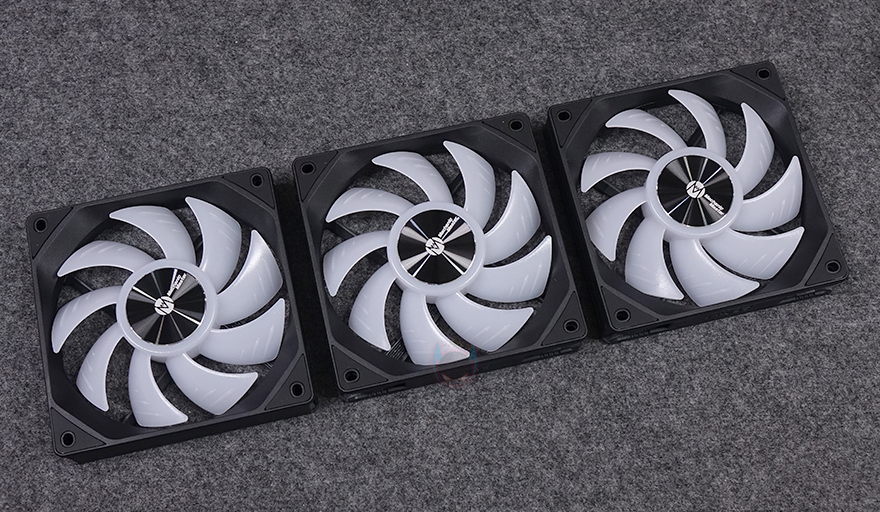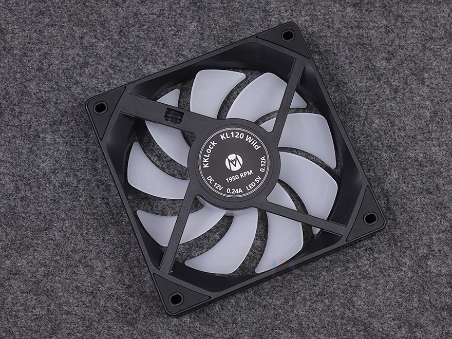 그럼, Mechanic Master(메카닉 마스터)의 KL120 Wild 팬을 살펴보면, 3 Pack 제품에는 당연히 팬 3개가 들어가 있고, 앞서 언급했듯이 구매 옵션에서 1개 구매도 가능하고, 블랙과 화이트 2가지 색상 중에 선택할 수 있습니다. 팬 크기는 전형적인 120x120x25mm 크기이며, 총 9개의 날개(Blade)를 갖추고 있으며, 중앙 베어링 부분은 알루미늄 재질에 로고 플레이트를 적용했습니다. 또한, 베어링은 최근 많이 사용하는 소음은 적고 긴 수명을 가진 HDB(Hydraulic Dynamic Bearing)을 적용해 베어링 면적이 넓은 것도 확인할 수 있죠. 날개 부분에는 풍량을 높이도록 많이 사용하고 있는 상어 지느러미 디자인(shark fin design)을 적용했습니다. 또한, 각 모서리 부분의 나사홀 주변에도 진동소음을 줄이도록 방진패드 디자인도 기본 적용되어 있죠. 팬 후면을 보면 데이지체인 방식이라 케이블이 없는 것을 확인할 수 있고, 중앙에 팬 최대 RPM속도를 표기해 놨습니다. 팬 측면 두께는 25mm로 KaKa Link와 Plug가 연결되는 측면은 연결 홈과 중앙에 KaKa Lock 로고를 새겨놨습니다. 연결 홈은 한쪽 측면에는 포고핀, 반대편에는 그냥 홈만 적용된 형태죠.