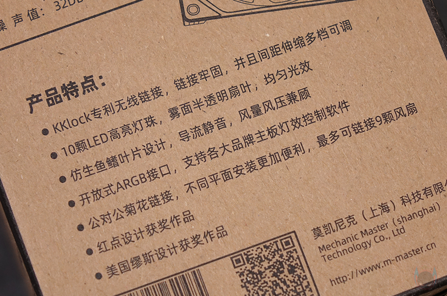 제품패키지는 박스형태로 리뷰에서는 팬 3개가 들어있는 3Pack 제품입니다. 물론, Mechanic Master 알리익스프레스 공식스토어에서 구입시 1 Pack과 3 Pack 중에 선택할 수 있죠. 박스 전면에는 3 Pack 제품이라 팬 3개의 이미지를 담고 있으며, 모델명과 함께 색상 구분, 주요 특징으로 상어 지느러미 날개 디자인을 표기해 놨습니다. 박스 한쪽 측면에는 팬 사양과 주요 특징을 좀 더 나열해서 표기해 놨는데, KKlock 특허 기술, 10개의 LED, 상어 지느러미 디자인, 메인보드 ARGB Sync 지원, 간격조절의 데이지체인 방식, 레드닷 디자인 어워드(Red Dot Design Award), 뮤즈 디자인 어위드(MUSE Design Awards) 언급을 확인할 수 있죠.