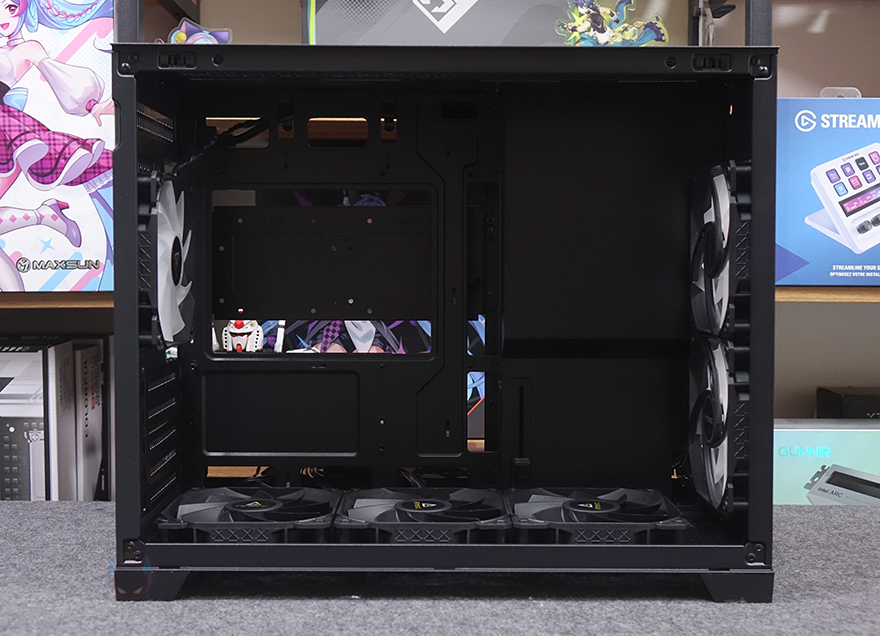 이제 FLUX M PC케이스의 내부를 살펴보는데, 미니타워이기 때문에 내부 구조는 아담하고 단순합니다. 메인보드가 장착되는 트레이는 미니타워 규격이라 M-ATX 폼 메인보드까지 장착할 수 있게 지원하고 있으며, 트레이 오른쪽에는 파워서플라이 자리를 가려주는 커버가 적용되어 있는데, 커버 아래에는 위아래 높낮이 조절의 그래픽카드 지지대도 적용되어 있죠. 내부 하단에는 방금 외부에서 확인한 내부 하단 쿨링시스템으로 120mm 팬이 3개 장착된 걸 확인할 수 있는데, 흡기 역할로 역날개의 리버스 팬입니다. 그리고, 내부 후면에는 배기 역할의 120mm 팬을 다시 확인할 수 있는데, 전면과 동일한 RGB 팬이죠. 그래서, FLUX M에는 총 6개의 팬이 기본 제공됩니다. 또한, 배기 팬 아래 PCI 슬롯가이드는 재사용이 가능한 착탈식으로 적용되어 있습니다.