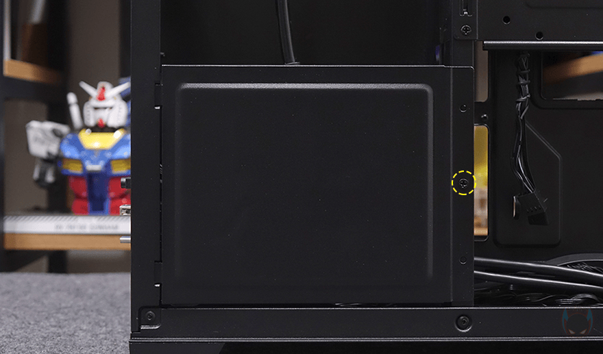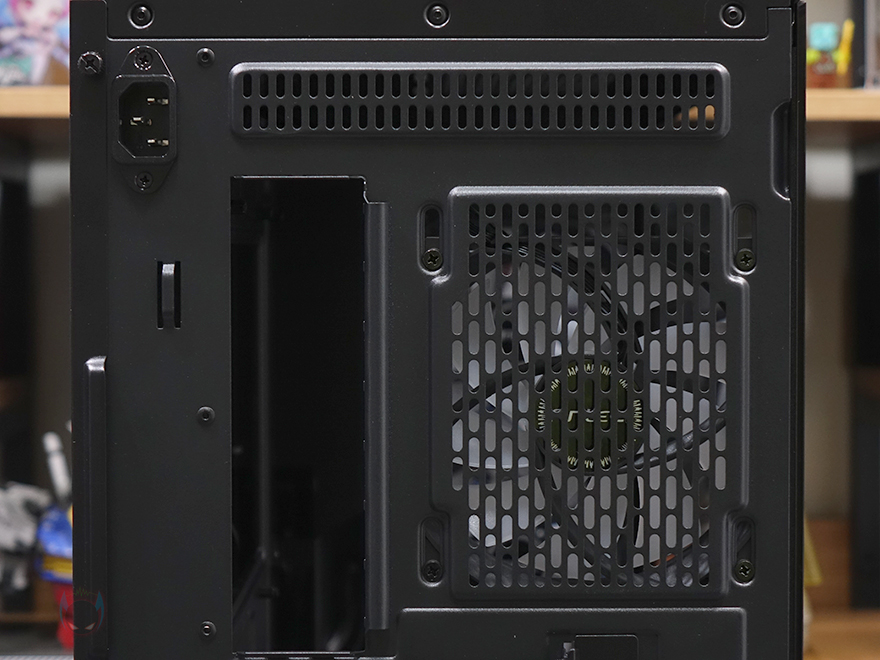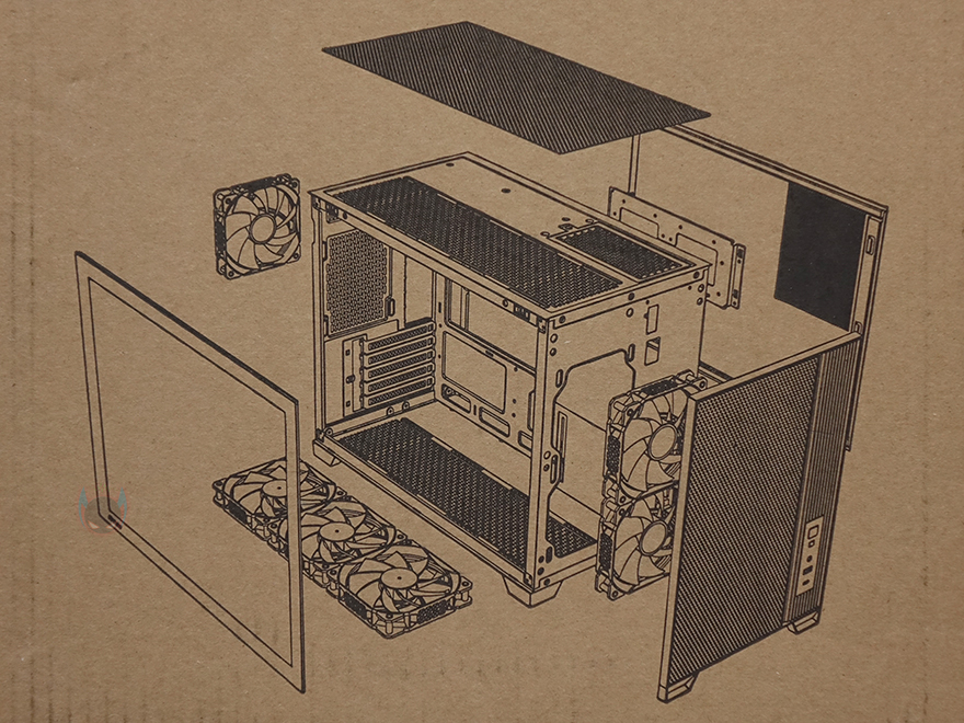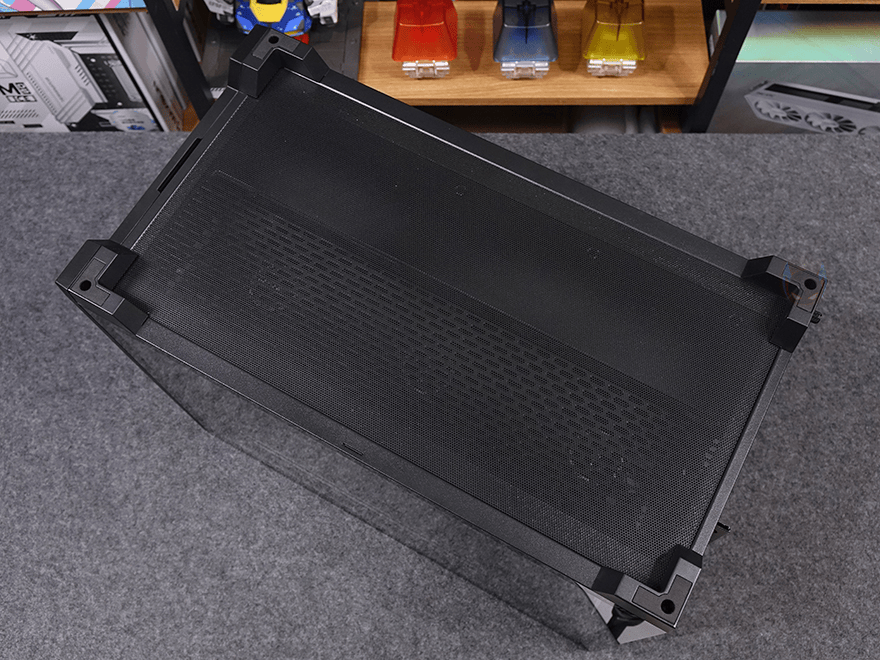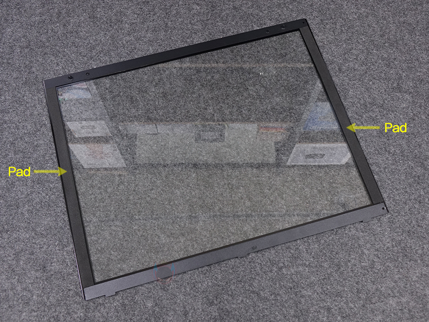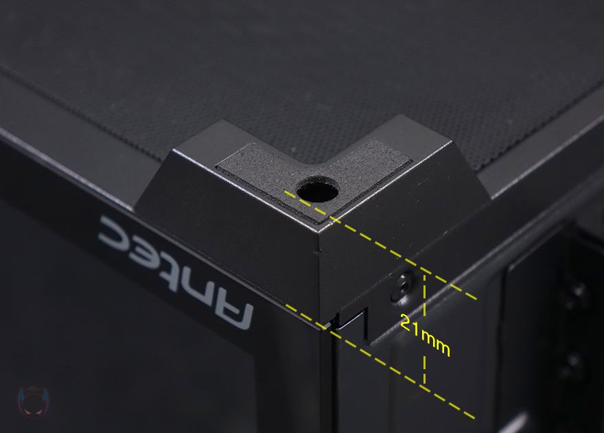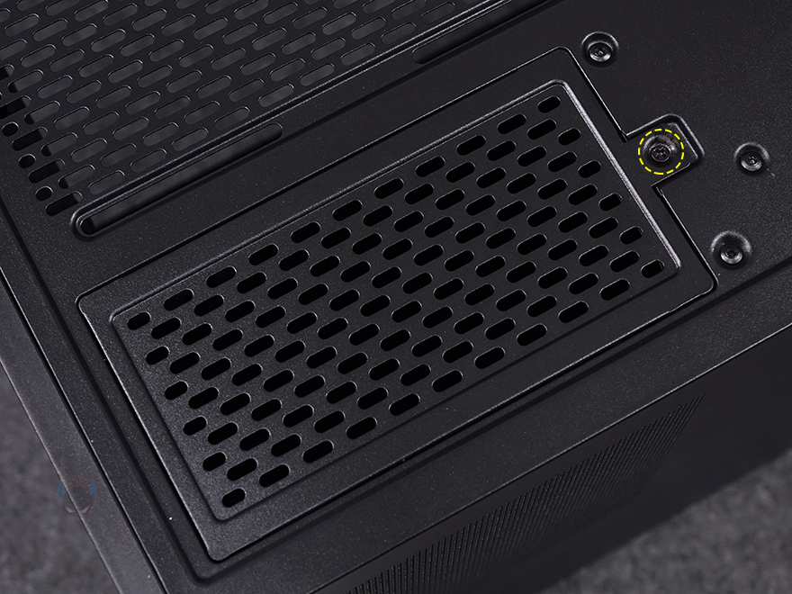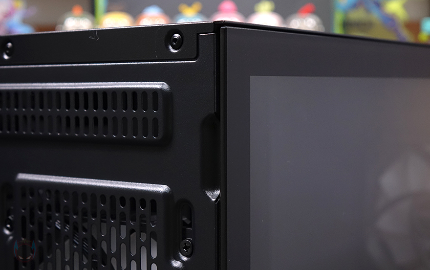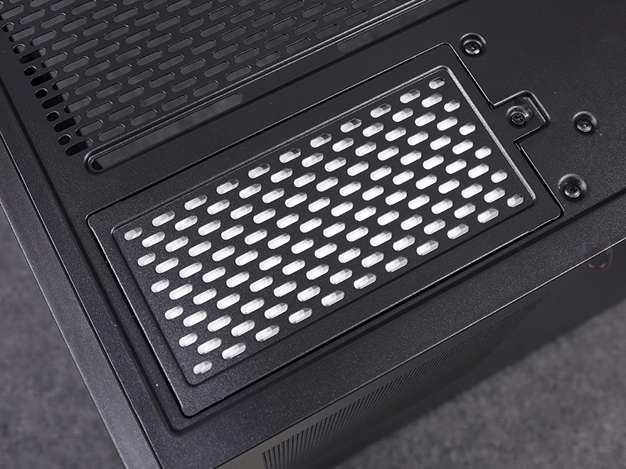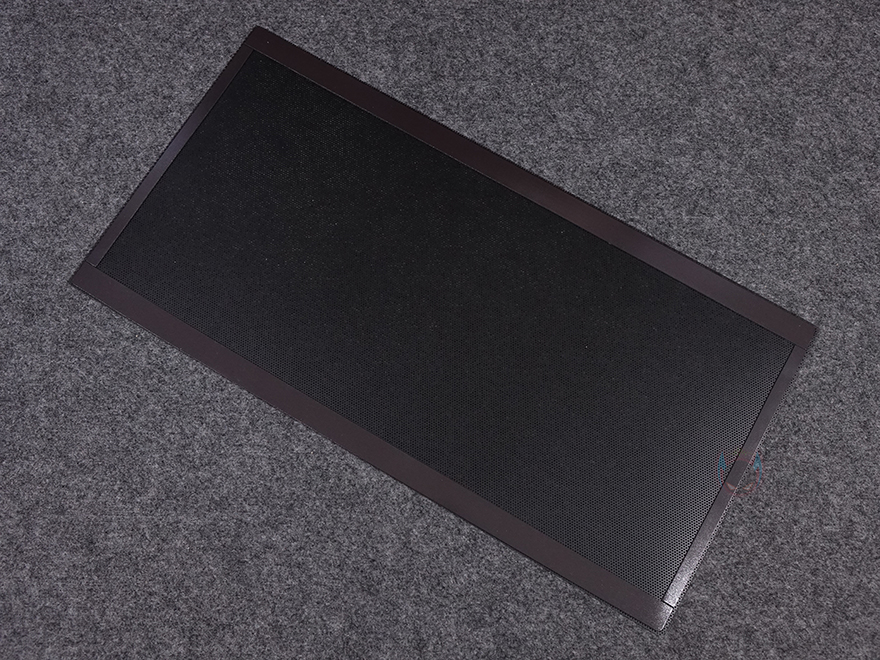 사이드 패널 같은 경우 전면 기준 왼쪽 패널은 강화유리 패널로 후면 손잡이 부분을 통해 쉽게 분리할 수 있는 무나사 방식의 볼-헤드핀을 적용했습니다. 그리고, 강화유리 패널 안쪽에는 위아래 파손방지를 위한 스틸 프레임, 양쪽으로는 패널을 장착할 때 충격보호를 위해 패드가 부착되어 있죠. 반대편 측면인 오른쪽 패널은 일반 새시 패널이며, 후면 위아래 손나사를 풀면 분리할 수 있고, 패널 앞쪽 윗부분에는 전면과 마찬가지로 메쉬 디자인이 적용되었는데, 내부 파워서플라이 자리에 쿨링효과를 주기 위함입니다. 역시 구멍이 촘촘하기 때문에 따로 필터는 적용되어있지 않습니다.