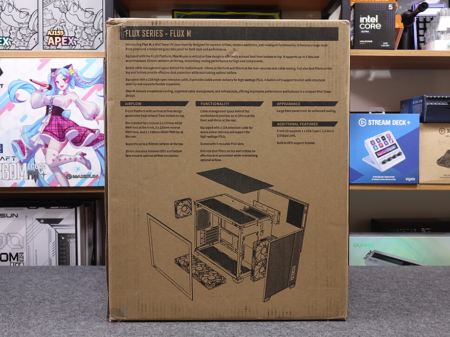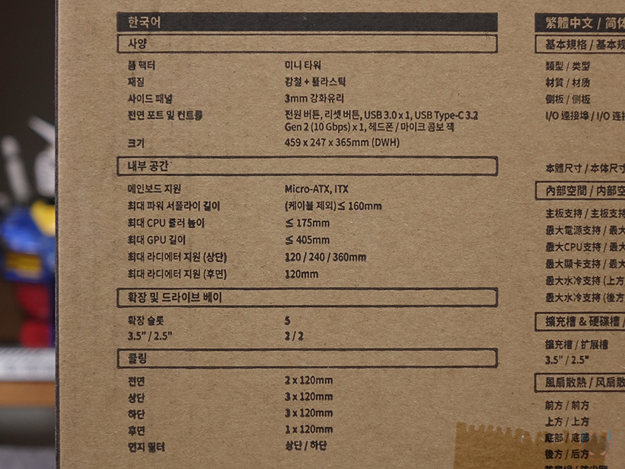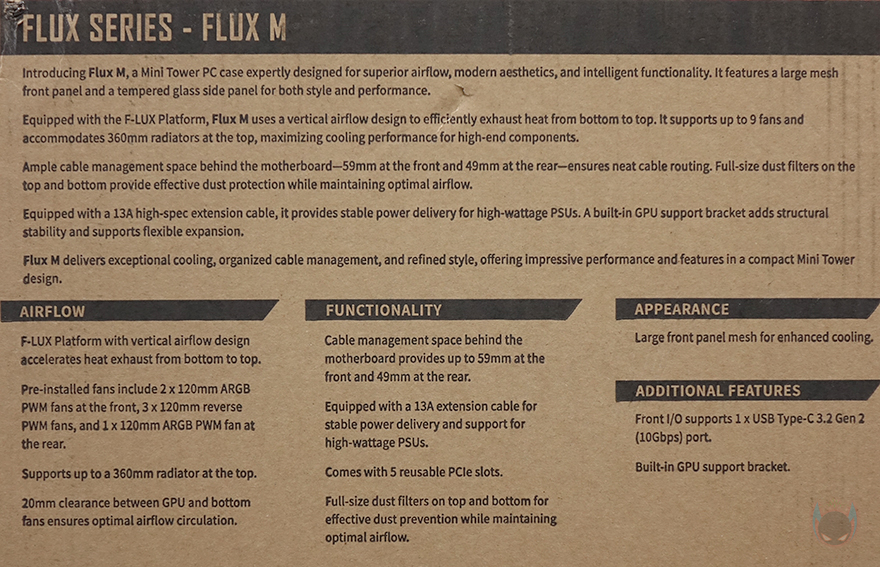 제품박스는 미니타워 제품답게 그동안의 FLUX 미들타워 제품들보다 작습니다. 박스 전면에는 제품 풀샷 이미지와 함께 모델명을 확인할 수 있는데, 이미지만 봐도 미니타워답게 작다라는걸 미리 알 수 있고, 반대편 박스 후면 맨 위에는 기존 자사 제품들처럼 FLUX M 소개를 담고 있으며, 바로 아래에는 주요 특징으로 쿨링 퍼포먼스 지원, 케이블 정리 공간, 파워서플라이 길이, PCI 슬롯, USB 포트 등을 언급해 놨고, 맨 아래에는 제품 분해도 이미지를 담고 있죠. 양쪽 측면에는 각 나라별 언어로 제품의 기본 사양을 표기해 놨는데, 한국어도 기본 포함되어 있고, CPU 쿨러 높이, 그래픽카드 길이 지원까지 상세하게 표기해 놨습니다.