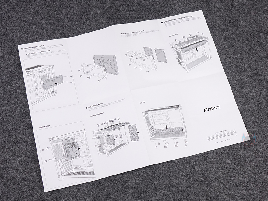 제품 포장은 PC케이스의 기본 포장이라 할 수 있는 비닐포장과 외부 충격보호를 위한 스티로폼 포장재를 사용했으며, PC케이스를 제외한 나머지 구성품은 별도의 박스에 담겨져 있는데, 개봉 시 PC케이스 상단 내부에 구성품 박스가 들어있습니다. 뒤에서 확인하겠지만, 정확히는 파워서플라이 자리에 들어있죠. 구성품에는 제품설명서, 부품 장착에 사용되는 나사들, 여분의 클램프와 소량의 케이블타이를 제공해주고 있으며, 제품설명서는 조립가이드로 이미지를 함께 담고 있어서 초보자도 쉽게 이해할 수 있습니다.