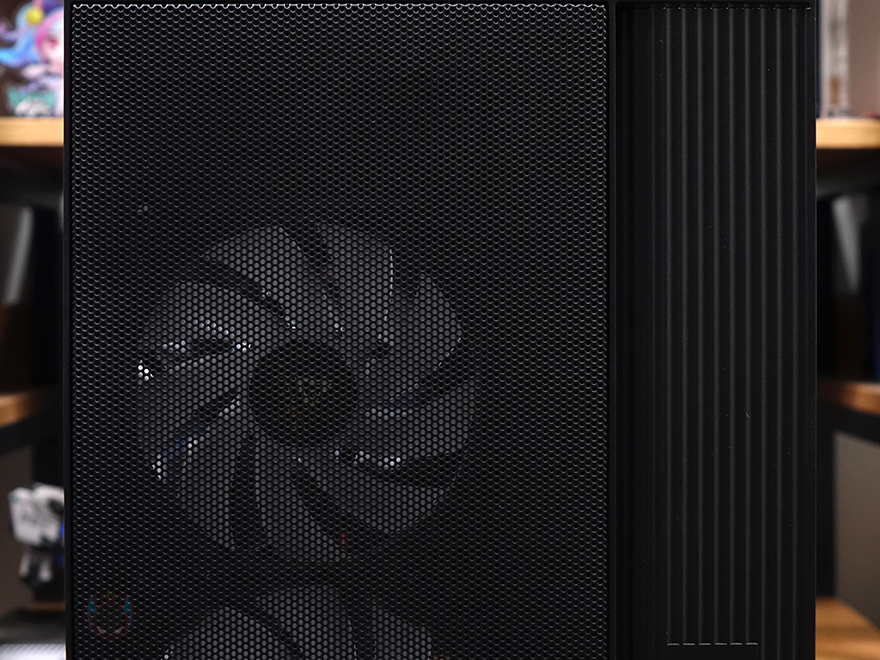 본격적으로 안텍(Antec) FLUX M PC케이스를 살펴보면, 일단 색상은 블랙 1가지로 출시했으며, 개봉시 왼쪽 측면 패널인 강화유리에 보호비닐이 부착되어 있습니다. 좀 더 부위별로 자세히 살펴보면, 먼저 전면에는 2/3 지점 왼쪽으로 전면 쿨링효과를 위한 메쉬 디자인을 적용하고 있으며, 나머지 1/3 지점 오른쪽으로는 템바보드 스타일의 디자인을 적용하고 있습니다. 그리고, 메쉬 디자인 안쪽으로 내부에 팬이 기본 장착된 걸 미리 확인할 수 있고, 오른쪽 아래로는 전원 버튼, 리셋 버튼, 오디오 포트, USB-A와 USB-C 포트가 배치되어 있죠. 메쉬 디자인 부분은 일반 타공보다 구멍이 작고 촘촘하기 때문에 따로 먼지 필터는 적용되어 있지 않고, 전면 베젤을 분리하면 내부에 120mm 팬 2개가 기본 장착된 걸 확인할 수 있는데, 모두 RGB 팬입니다.