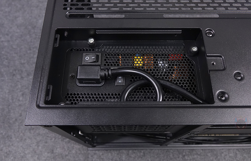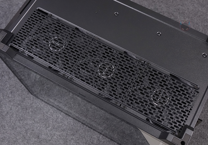 FLUX M PC케이스 상단에는 테두리 라인을 제외하고 전체 자석방식의 먼지 필터가 부착되어 있으며, 필터는 분리하면 가운데를 기준으로 왼쪽 편으로는 내부 상단 쿨링시스템을 갖출 수 있게 에어홀과 나사홀이 처리되어 있습니다. 팬 장착 시 최대 120mm 팬 3개를 장착할 수 있고, 수냉쿨러시 최대 360mm 라디에이터를 장착할 수 있죠. 그리고, 오른쪽 앞부분에는 앞서 구성품 박스가 들어있던 파워서플라이 자리로 나사를 풀면 커버를 분리할 수 있고, 전원케이블 연장선도 미리 확인할 수 있습니다.