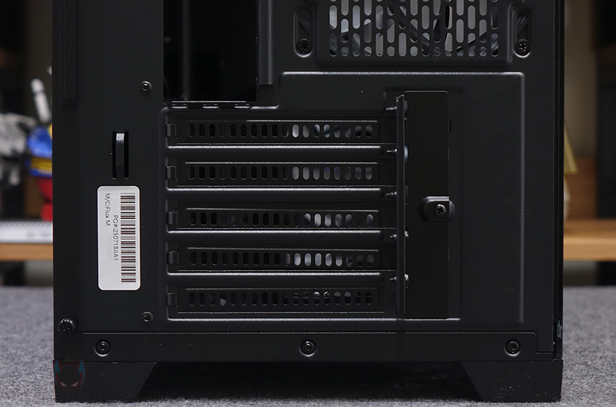 FLUX PC케이스 후면에는 맨 윗부분 왼쪽에 전원케이블 연장선 포트가 배치되어 있으며, 아래에는 케이블 정리 시 묶을 수 있는 홀더 처리를 해놨고, 같은 위치 맨 오른쪽에는 후면 배기역할로 일자형 패턴의 에어홀 처리와 함께 내부에 120mm 팬이 기본 장착된 걸 미리 확인할 수 있습니다. 그리고, 아래에는 미니타워 기준인 4개보다 1개 더 많은 PCI 슬롯을 확인할 수 있고, 역시 같은 위치 왼쪽에 케이블정리 홀더를 적용해 놨죠. 외형 끝으로, PC케이스 밑바닥 부분에는 상단과 마찬가지로 전체 자석방식의 먼지 필터가 장착되어 있는데, 상단 먼지 필터와 똑같은 크기를 가졌기 때문에 서로 바꿔서 사용할 수 있습니다. 그리고, 필터를 분리하면, 상단과 마찬가지로 하단 역시 쿨링 지원을 하는데, 상단과 달리 하단은 내부에 팬이 기본 장착된걸 미리 확인할 수 있습니다. 참고로, PC케이스 받침대 높이는 약 21mm입니다.
