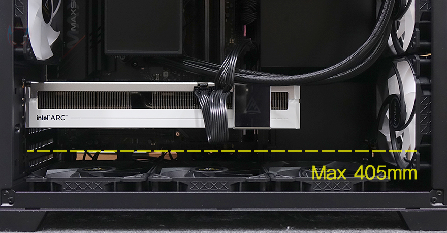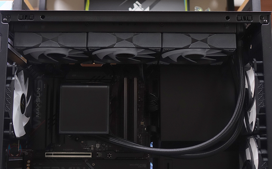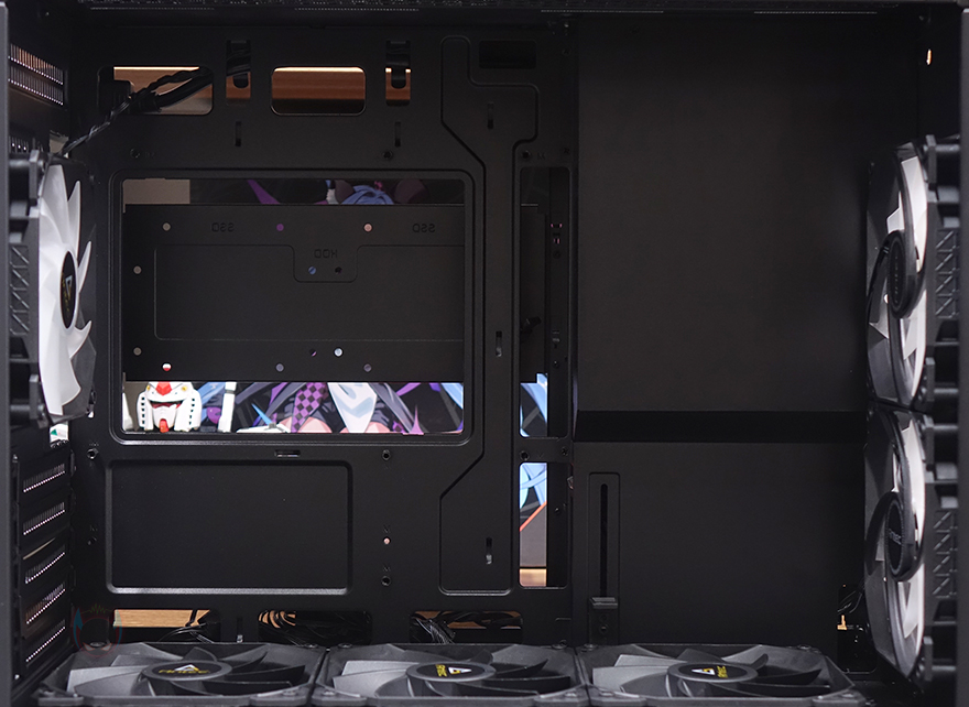 그럼, 안텍 FLUX M PC케이스를 사용해 시스템 조립을 해봐야겠죠? 미니타워이고, 파워서플라이가 전면 앞자리에 장착되는 듀얼챔버 구조인만큼 파워서플라이부터 장착하는 게 조립과정이 수월합니다. 파워서플라이는 기본 ATX 규격만 지원하지만, SFX 규격의 파워서플라이 같은 경우 기본 ATX 어댑터 브래킷을 함께 제공하는 경우가 많기 때문에, 어댑터 브래킷이 있다면, SFX 파워서플라이를 장착하는 것도 좋습니다. 미니타워 특성상 공간확보가 중요하기 때문에 SFX 파워서플라이를 장착하면 그만큼 더 많이 공간확보를 할 수 있기 때문이죠. 그리고, ATX 기준으로 파워서플라이 최대 깊이 지원은 160mm입니다. CPU쿨러 같은 경우에는 앞서 언급했듯이 수냉쿨러시 상단에 최대 360mm 라디에이터를 장착할 수 있기 때문에, 필자 역시 360mm 라디에이터를 장착했으며, 공랭쿨러인 타워형 쿨러를 장착한다면, 최대 175mm 높이까지 지원합니다. 이 밖에 그래픽카드는 전면 기본 팬이 장착된 기준에서 최대 405mm 깊이까지 지원해 사실상 시중에 판매되는 그래픽카드는 대부분 간섭 없이 장착이 가능합니다. PC 기본 구성품 장착이 끝나면 메인보드 트레이 후면 공간에서 케이블 정리를 해주면 되고, 저장장치 브래킷이 케이블 정리 커버 역할도 하기 때문에, 대충 케이블을 정리해도 커버를 통해 깔끔하게 보일 수 있습니다.
