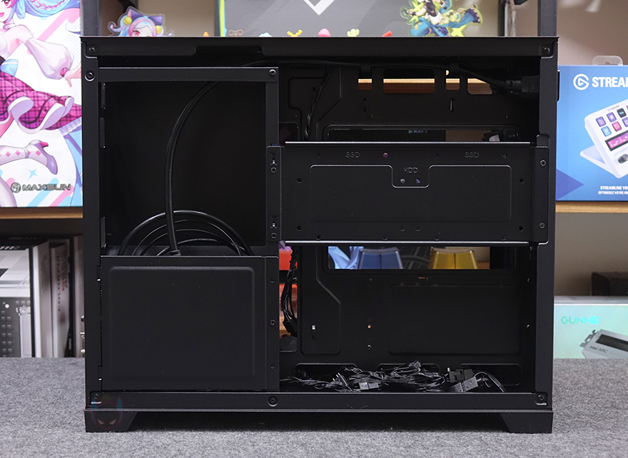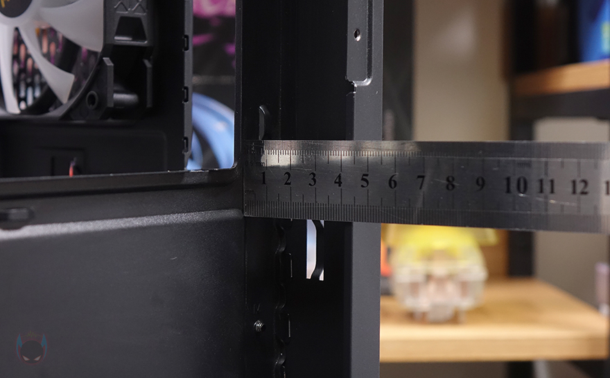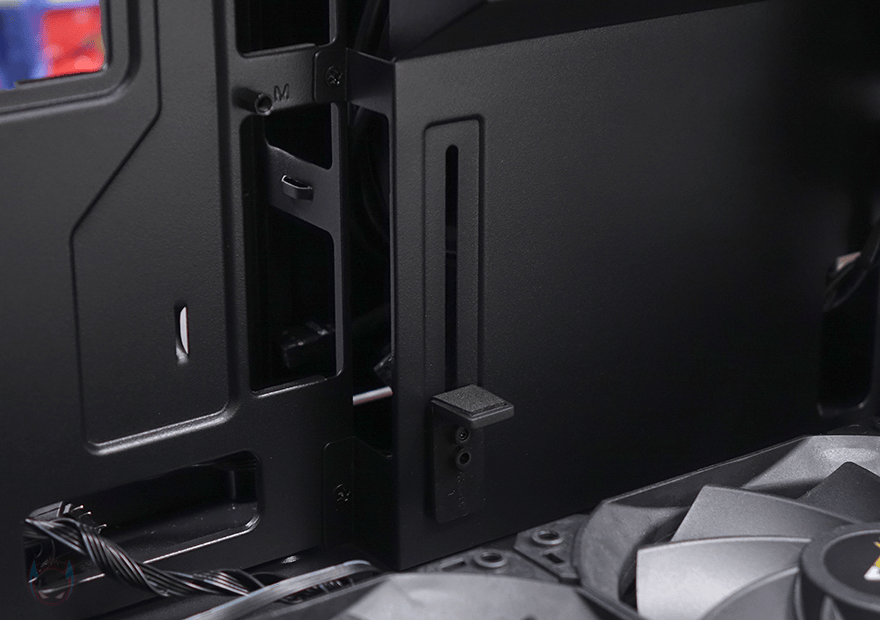 메인보드 트레이 후면에는 CPU-컷-아웃 위치에 저장장치 브래킷을 장착하고 있는데, 양쪽 나사를 풀고 위로 올리면 쉽게 분리할 수 있습니다. 저장장치는 브래킷 안쪽으로 장착되는데, 3.5인치 HDD 또는 2.5인치 HDD/SSD를 최대 2개 장착할 수 있고, 하나씩 겸용으로도 장착할 수 있습니다. 그리고, 만약 저장장치 브래킷을 사용하지 않는다면, 트레이 후면을 케이블 공간으로 활용할 수 있는데, 약 49mm 깊이를 가졌습니다. 또한, 트레이 후면 앞자리에는 앞서 여러 번 언급했듯이 파워서플라이 자리로 미니타워지만, 파워서플라이를 하단이 아닌 후면 수직방향으로 장착할 수 있는 컴퓨터 어항케이스에서 주로 볼 수 있는 듀얼챔버 구조를 적용했습니다. 바로 아래에는 케이블 가려주는 커버도 적용되어 있죠. 물론, 나사를 풀면 쉽게 분리할 수 있고, 약 59mm의 깊이를 가지고 있어서 케이블 정리공간으로도 활용할 수 있습니다.