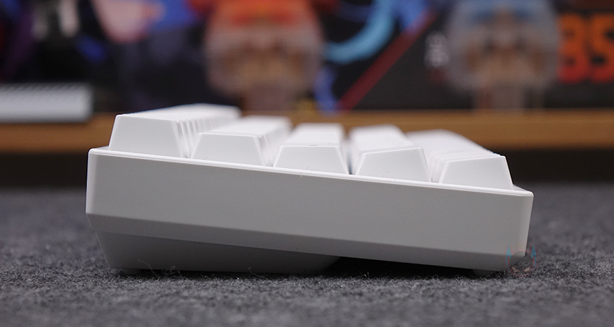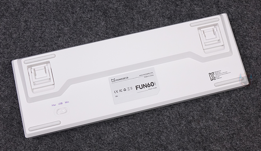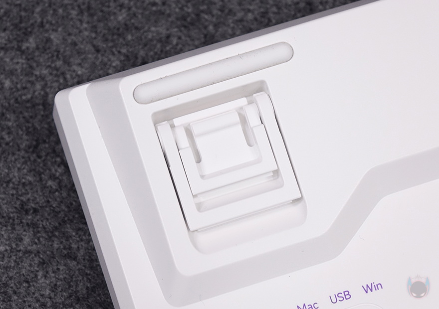 이 밖에도 키보드 전면 왼쪽편에는 USB 케이블과 연결되는 USB-C 포트가 배치되어 있으며, 키보드 밑바닥 부분에는 모서리 부근으로 미끄럼방지 패드가 기본 부착되어 있으며, 양쪽 앞자리에는 2단계 높낮이조절 받침대가 적용되어 있는데, 받침 부분에도 패드가 부착되어 있습니다. 그리고, 왼쪽 받침대 아래에는 연결모드와 WIN/Mac 레이아웃 스위치가 적용되어 있으며, 키보드 측면에서 보면 타이핑에 최적화라 불리는 스텝-스컬쳐 2 단계 배열을 확인할 수 있습니다.