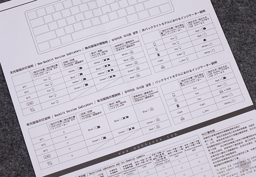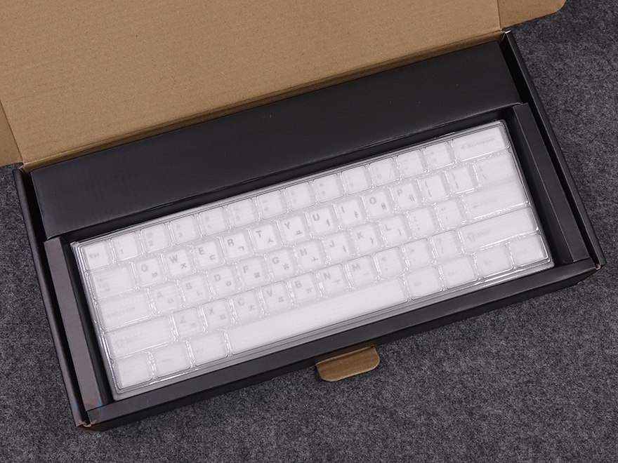 커버 안에 들어있는 속박스를 옆으로 빼내어보면, 속박스에 MONSGEEK 로고를 확인할 수 있으며, 박스를 열어보면, 포장된 FUN60 Max 키보드를 확인할 수 있는데, 투명 루프도 기본 제공해줍니다. 제품 전체 구성은 FUN60 Max 키보드, USB 충전 및 유선케이블, 무선 2.4G 리시버, 키캡&스위치 리무버, 제품 설명서로 이루어져 있으며, 국내 정식 출시된 제품이기 때문에 설명서에는 한국어도 포함되어 있습니다.