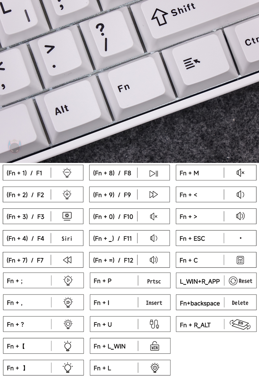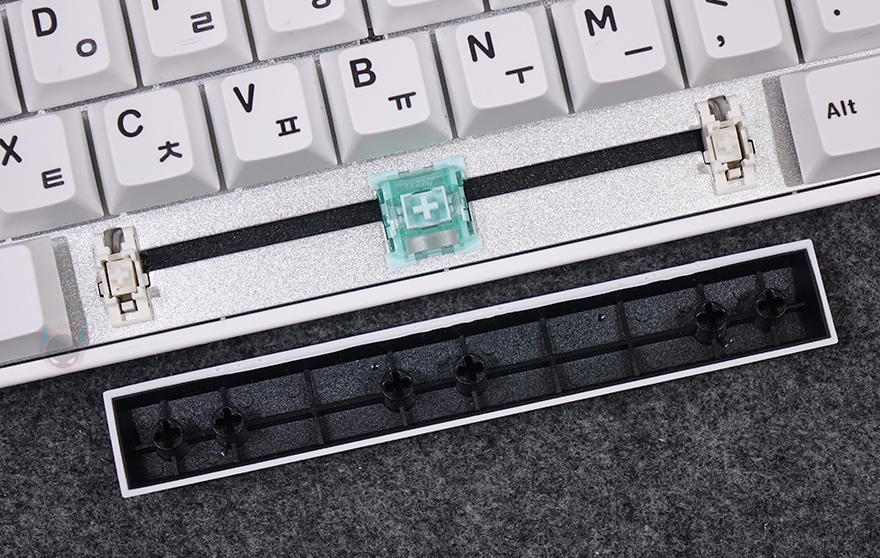 좀 더 자세히 살펴보면, 키캡은 PBT 재질에 이중사출 방식인데, 국내 정식 출시 제품은 한글 각인까지 적용되어 있으며, 안쪽 사출부분이 100% 채워진 형태입니다. 참고로, 글로벌버전은 키캡 측면 아랫부분에 영문 각인이 되어 있습니다. 스위치는 시작에서 언급했듯이 자석 스위치라 불리는 Akko 글레어 스위치가 적용되었으며, 스위치를 분리하면 PCB기판 아랫부분에 LED가 적용된 남향인걸 확인할 수 있습니다. 참고로, 스위치는 Akko 제품이 아니라도 타사의 자석 스위치도 호환 지원합니다. 그리고, 스페이스-바 같은 긴 키들의 스테빌라이저는 자석 스위치가 적용된 만큼 와이어는 비자성을 사용했으며, 체리식에 기본 윤활도 처리되어 있죠. 또한, FUN60 Max에는 Fn키가 적용되어서 부가 기능들도 지원하는데, 키캡에 따로 표기를 해놓지 않았기 때문에 처음 사용 시에는 설명서를 참고해서 숙지할 필요가 있습니다.