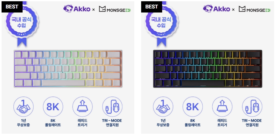 최근 국내시장에도 진출한 Akko(악코)와 서브 브랜드 MONSGEEK(몬스긱)에서 출시한 61키 60% 배열의 미니키보드 FUN60 시리즈 모델 중 하나인 FUN60 MAX는 요즘 키보드 시장의 핵심 트렌드인 8K 전송제어속도와 자석축 스위치 조합을 갖추고 나왔습니다. 미니키보드를 선호하면서 작업과 게임 모두를 즐기는 소비자입장에선 이 두 조합만으로 이미 충분히 매리트를 느낄 수 있는데, 여기에 5만 원대라는 저렴한 가격까지 더해 더 끌릴게 해줍니다. 특히, 국내시장에 정식 출시되면서 한글 각인까지 적용되어 미니키보드를 처음 사용하는 소비자에게도 익숙할 수 있죠. 물론, 미니키보드 특성상 작은 사이즈에 다양한 기능을 담고 지원하기 때문에 초반 사용 시에는 적응이 필요합니다. 하지만, 소프트웨어도 지원하고 있어서 크게 기능을 익히는데 어려움이 없고, 자석축 스위치를 적용한 만큼 래피드 트리거와 스트로크 설정을 모두 다룰 수 있는 만큼 환경에 따라서 자석축 혹은 기계식 키보드의 일반 스위치 감각으로 사용할 수 있습니다. 여기에 키 백라이트 효과도 남향으로 적용하고, 키캡 사이로만 볼 수 있어서 피로감이 적고, 모드는 20가지나 지원해주고 있죠. 또한, 유선/무선 2.4G/블루투스 3가지 연결모드 지원해 다양한 디바이스에 연결해 언제든지 사용할 수 있습니다. 저렴하면서도 요즘 키보드시장의 트렌드를 모두 담은 미니키보드를 원했다면, Akko MONSGEEK FUN60 Max 키보드를 추천합니다.