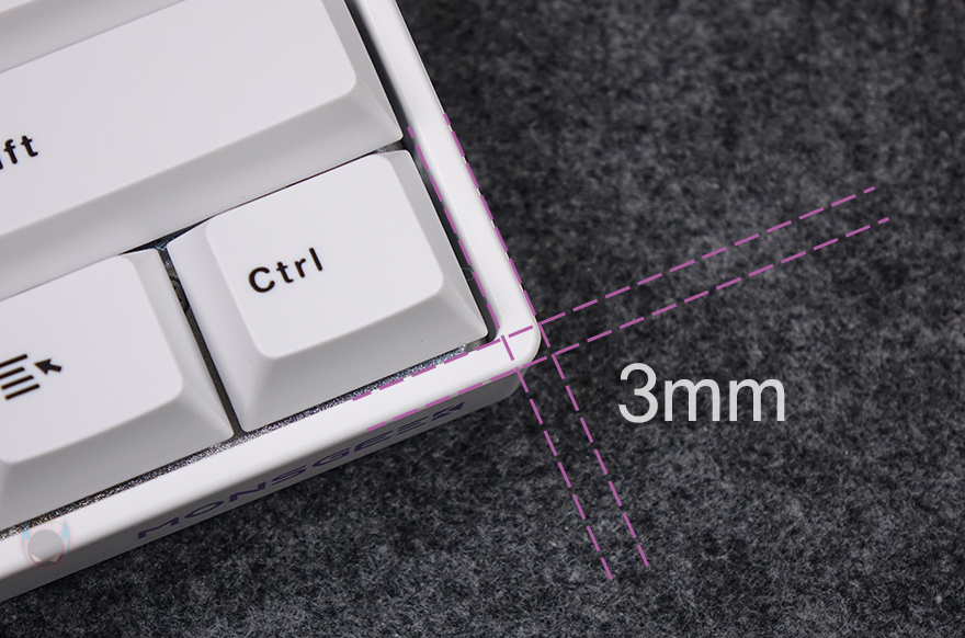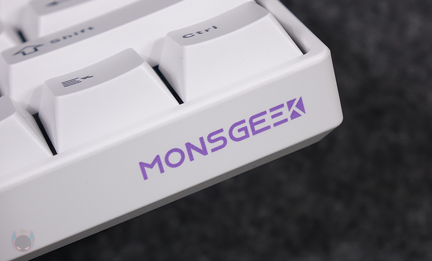 본격적으로 Akko MONSGEEK FUN60 Max 키보드를 살펴보면, 일단 색상은 화이트와 블랙 2가지로 출시했으며, 한눈에 봐도 풀-배열 키보드나 텐키리스 키보드보다 작은 미니키보드라는걸 알 수 있는데, 실제로 비교해 보면 더 체감이 됩니다. 총 키수는 61로 60% 배열에 해당되며, 무게는 약 535g이고, 하우징 베젤은 다른 미니키보드 제품들과 마찬가지로 흔히 제로베젤이라 부르는 3mm 두께 수준이며, 오른쪽 아래에 로고를 새겨놨습니다.