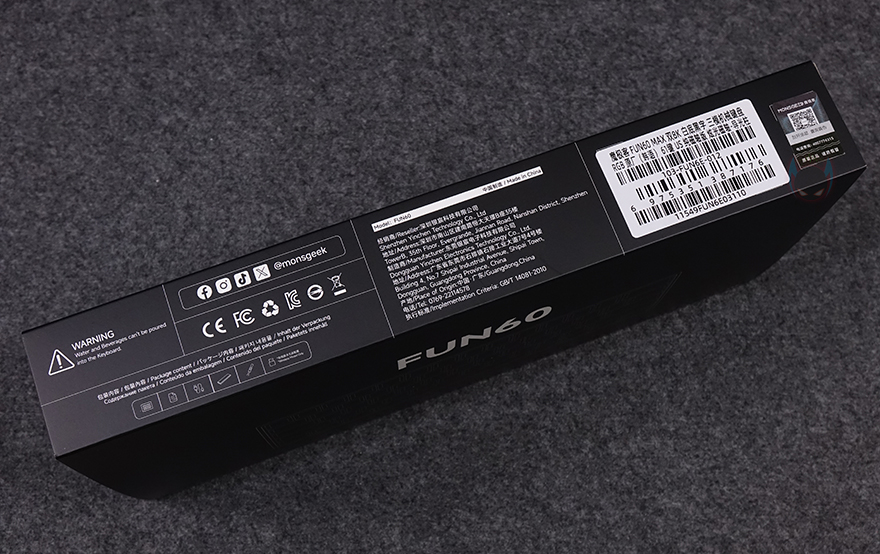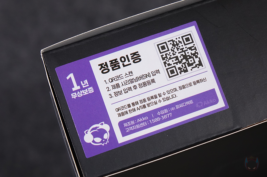 제품패키지부터 살펴보면, 속박스에 밴딩커버 종이가 적용된 패키지로 커버 전면에는 모델명과 함께 키보드 디자인 이미지가 실려있는데, 모델명과 이미지를 통해 미니 키보드라는걸 미리 알 수 있죠. 참고로, FUN60 Max는 FUN60 시리즈 모델 중 하나이며, Max 외에도 Pro와 Ultra 2가지 모델이 더 있습니다. 그리고, 이미지에서 알 수 있듯이 키 RGB 백라이트 효과도 적용되었다라는 걸 미리 알 수 있고, 후면에는 백라이트 효과가 없는 이미지를 담고 있죠. 커버 한쪽 측면에는 제품의 구성목록을 확인할 수 있으며, 속박스 한쪽 측면에는 정품등록 안내를 확인할 수 있는데, 국내 Akko 정식수입사는 PC하드웨어 종합 유통사로 유명한 피씨디렉트에서 맡고 있습니다.