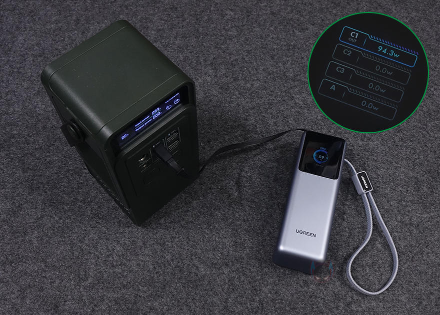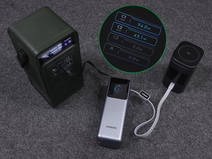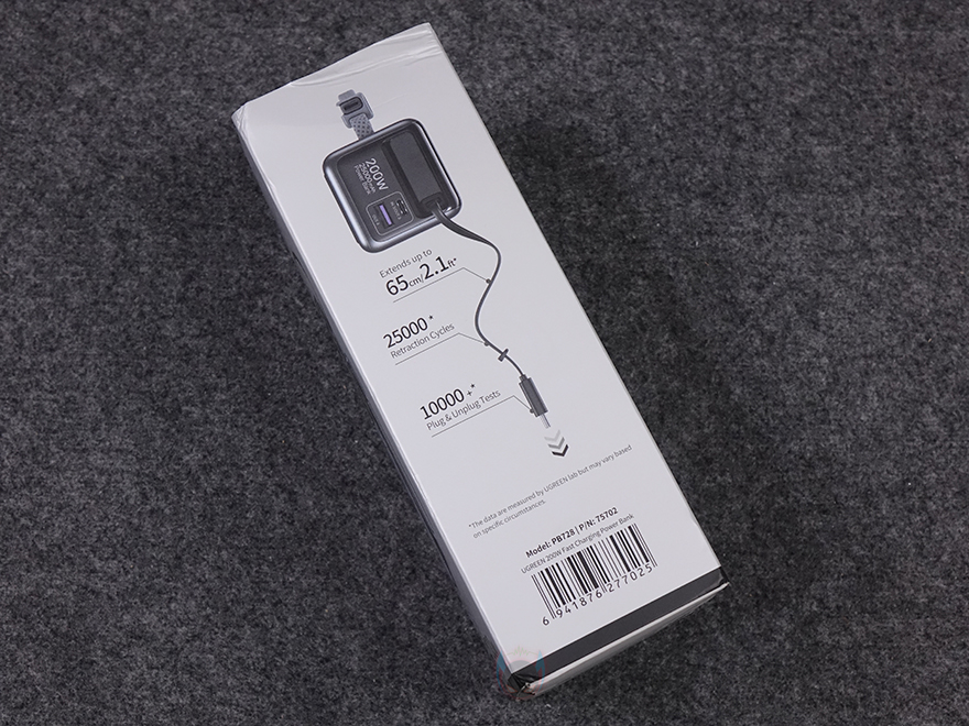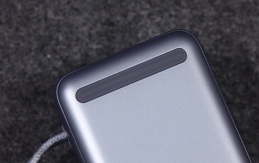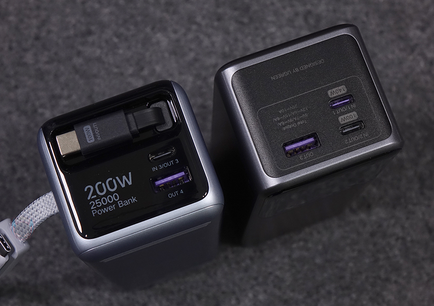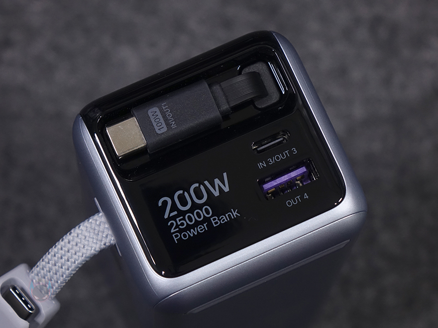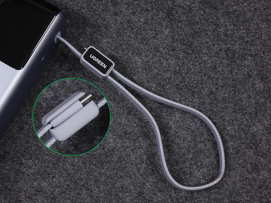 보조배터리 상단에는 이전 구형 모델과 포트 배치는 유사하지만, 역시 가장 큰 차이점은 상단에도 충전 케이블이 내장되어 있습니다. 특히, 상단에 배치된 내장 충전케이블은 줄자형식으로 길이조절이 가능하고, 수납될 때 마그네틱 방식이라 케이블이 엉킬 경우가 발생하지 않습니다. 상단 내장 케이블은 총 65cm 길이를 가졌고, 역시 입/출력 최대 100W를 지원하죠. 그리고, 나머지 포트로 배치된 USB-C 포트와 USB-A 포트는 각각 입출력 최대 100W와 출력 22.5W를 지원합니다. 그러니깐 USB-C 케이블과 포트는 모두 단일 사용 시 100W를 지원하는 거죠. 물론, USB-C를 2개 사용해도 최대 200W로 지원합니다.