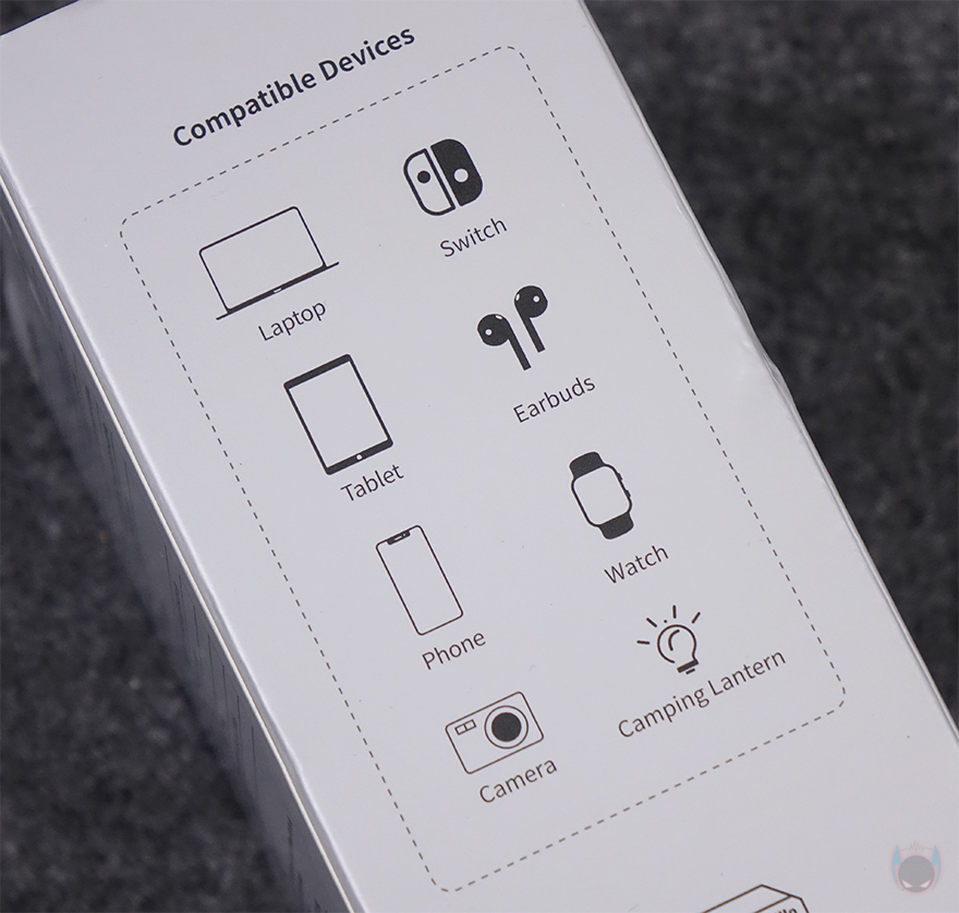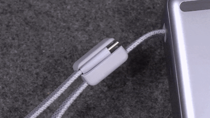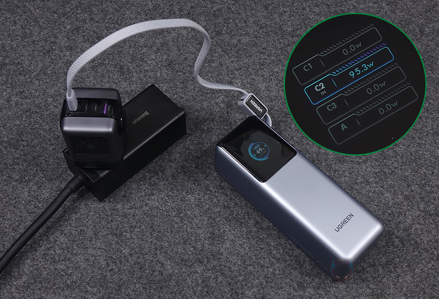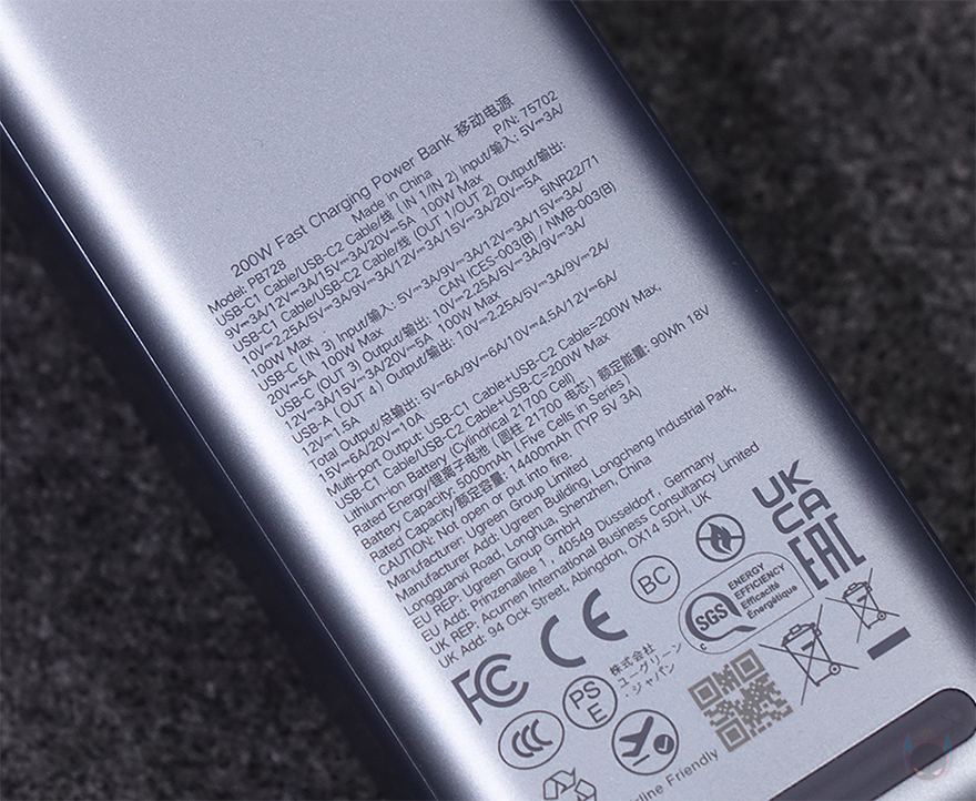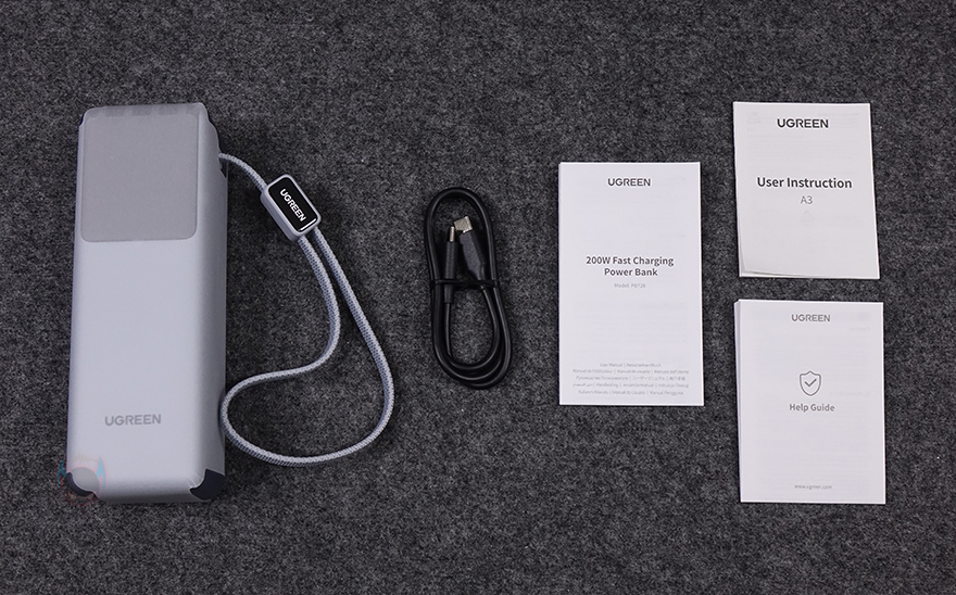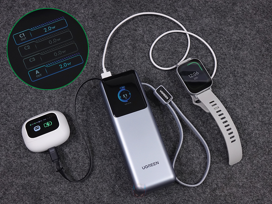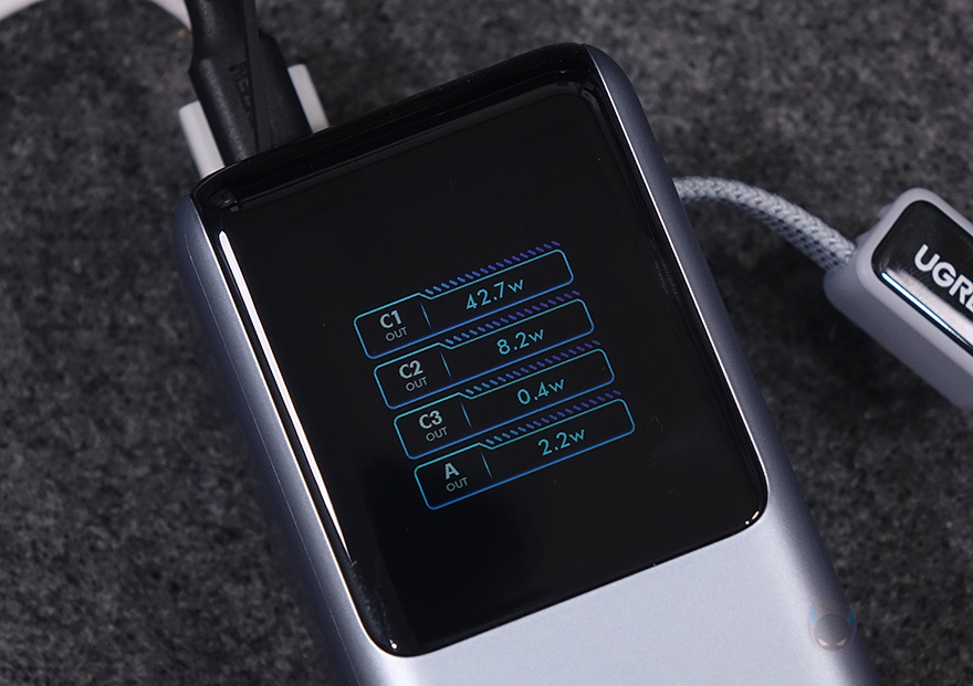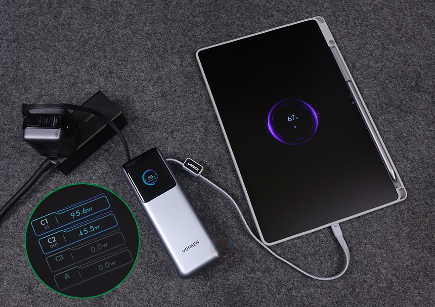 보조배터리 상단에는 이전 구형 모델과 포트 배치는 유사하지만, 역시 가장 큰 차이점은 상단에도 충전 케이블이 내장되어 있습니다. 특히, 상단에 배치된 내장 충전케이블은 줄자형식으로 길이조절이 가능하고, 수납될 때 마그네틱 방식이라 케이블이 엉킬 경우가 발생하지 않습니다. 상단 내장 케이블은 총 65cm 길이를 가졌고, 역시 입/출력 최대 100W를 지원하죠. 그리고, 나머지 포트로 배치된 USB-C 포트와 USB-A 포트는 각각 입출력 최대 100W와 출력 22.5W를 지원합니다. 그러니깐 USB-C 케이블과 포트는 모두 단일 사용 시 100W를 지원하는 거죠. 물론, USB-C를 2개 사용해도 최대 200W로 지원합니다.