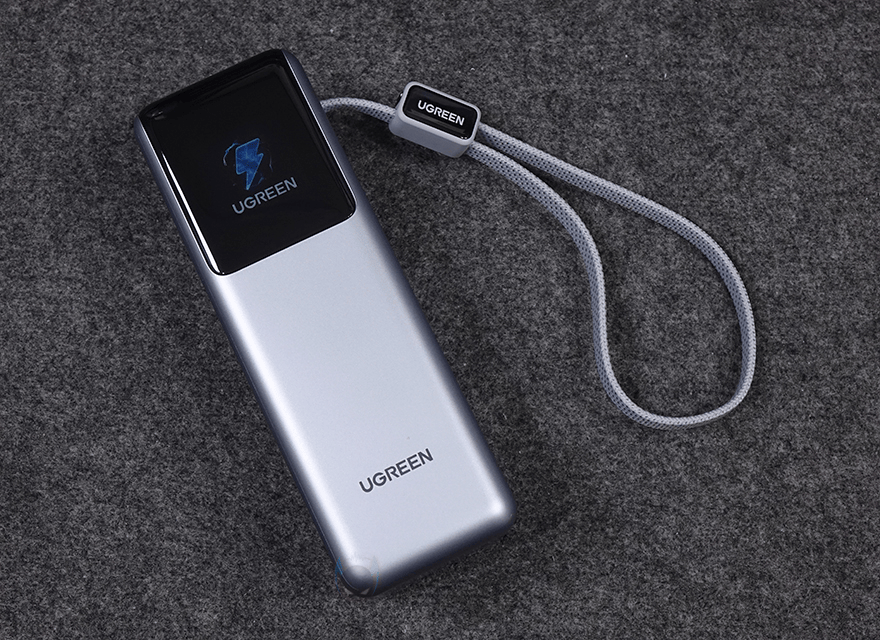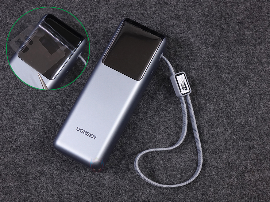 본격적으로 유그린의 넥소드 프로 신형 200W(25000mAh) 보조배터리를 살펴보면, 보조배터리의 크기는 이전 구형 모델과 비슷합니다. 스마트 TFT 디스플레이 위치나 아래 UGREEN 로고 부분도 동일하죠. 다만, 색상 디자인 부분에서 이전 모델은 다크 그레이 계열이었다면, 신형은 라이브블루계열의 밝은 색상을 적용했습니다. 그리고, 무엇보다 눈에 띄는 점은 바로 우측에 스트립이 추가되었는데, 단순 스트립이 아닌 충전케이블을 스트립형식으로 적용한 거죠. 이미 자사 최신 보조배터리 제품에도 적용되는 부분이기도 하고 최근 출시되는 보조배터리의 주요 트렌드이기도 합니다. 외출로 보조배터리를 챙겨야 할 때 케이블을 함께 챙겨야 하는 번거로움을 해결해 주죠. 스트랩의 충전케이블은 유그린 로고가 새겨진 홀더 부분에 끼워진 케이블을 위로 조금 밀어 올려서 옆으로 빼내는 방식으로 수월합니다. 그리고, 케이블도 플랫타입에 패블릭재질로 깔끔하게 슬리빙 처리되어 있죠. 길이는 30cm이고, USB-C 포트로 입/출력 최대 100W를 지원합니다. 또한, 스트랩과 보조배터리 연결부 아래에는 전원버튼이 배치되어 있죠.