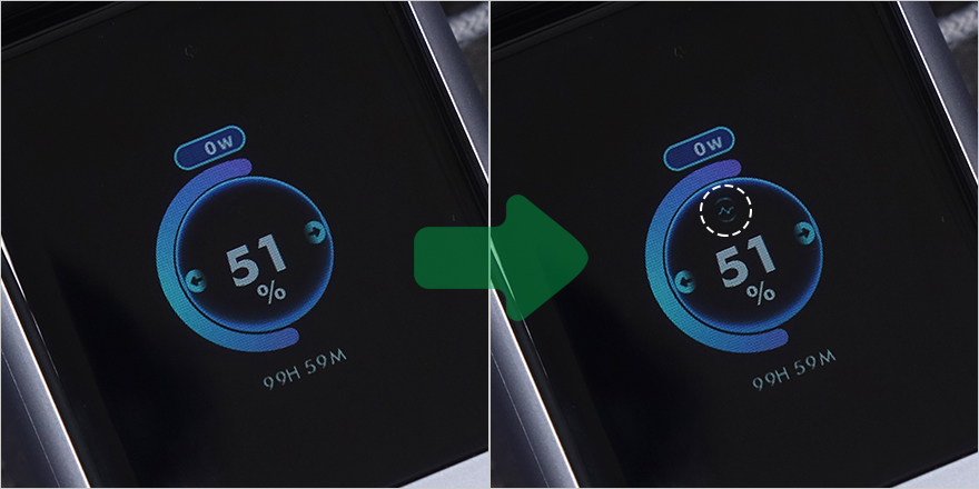 직접, 유그린 신형 200W(25000mAh) 보조배터리를 사용해 보면, 우측 전원버튼을 한번 누르면 바로 전면 상위에 위치한 스마트 TFT 디스플레이 화면이 동시에 켜집니다. 유그린 로고의 짧은 부팅이 지난 후 배터리 잔량을 보여주는데, 이전 모델과 달리 화면 디자인이 바뀐걸 바로 알 수 있으며, 켜진 상태에서 전원 버튼을 한 번 더 누르면 배터리 수명과 사용횟수를 보여줍니다. 이는 기존 보조배터리에서는 볼 수 없었던 부분으로 좀 더 보조배터리를 신경쓰고 관리할 수 있게 해줍니다. 그리고, 전원버튼을 3초 이상 누르고 있으면 전원 Off시 종료화면도 볼 수 있는데, 역시 디자인이 바뀌었습니다.
