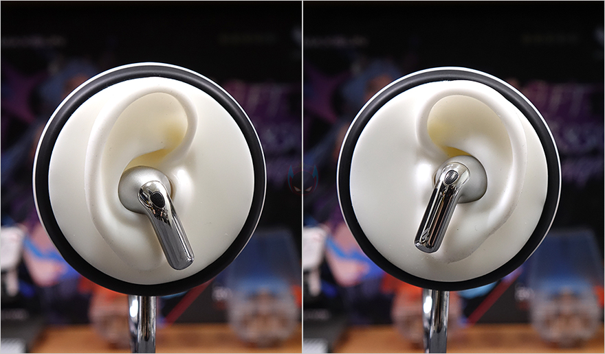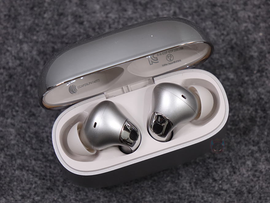 충전케이스에서 이어폰을 꺼내 살펴보면, 케이스 색상에 맞춰서 이어폰 색상 역시 통일시켰으며, 개당 이어폰의 무게는 약 4.8g입니다. 그리고, 이어폰 디자인은 스틱형으로 스틱부분에 케이스 오픈 부분과 마찬가지로 맥기 코팅을 적용했습니다. 개당 이어폰에는 3개의 마이크 내장으로 좌우 총 6개가 포함되어 있는데, 바깥쪽 스틱 부분의 윗부분에는 주변 소음 감지의 노이즈 캔슬링 마이크, 이어-팁 안쪽에는 귀에 들리는 소음 감지의 노이즈 캔슬링 마이크, 스픽 아래 충전 단자 사이에는 대화 마이크가 배치되어 있죠. 그리고, 스틱 양쪽에는 약간의 평면 홈이 처리되어 있는데, EvoBuds Pro 같은 경우 일반적인 무선 이어폰의 터치탭 방식이 아니라 압력을 감지해서 컨트롤합니다. 또한, 이어폰 윗부분에는 착용 감지 센서, 이어-팁 안쪽의 덕트 내부에는 10mm와 6mm 듀얼 다이내믹 드라이버 유닛이 탑재되어 있죠.