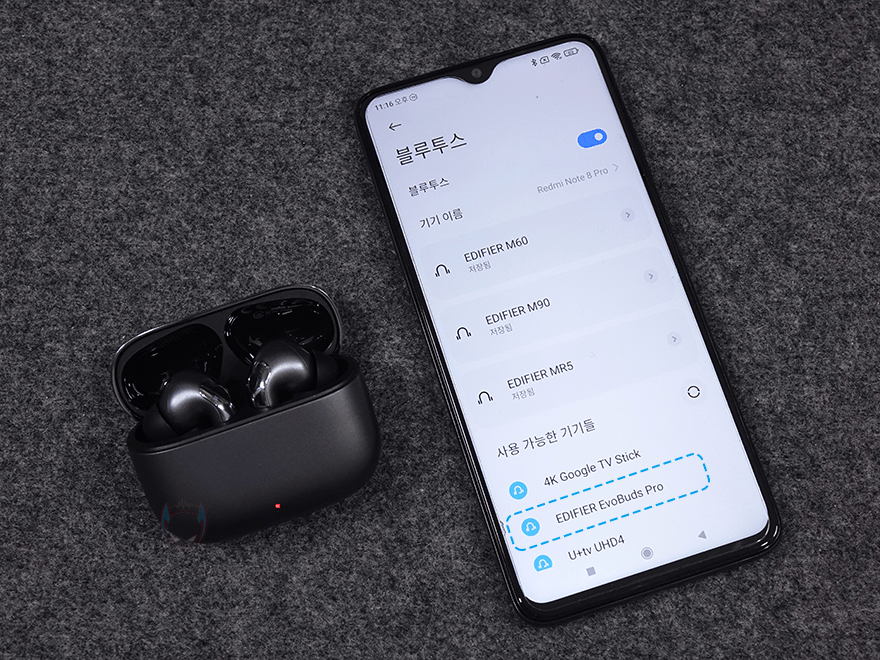 직접, 에디파이어 EvoBuds Pro 무선 이어폰을 사용해보면, 먼저 블루투스 연결은 다른 무선 이어폰들과 마찬가지로 충전케이스를 열면 자동으로 페어링 모드가 시작됩니다. 만약, 페어링 모드가 작동하지 않으면, 오른쪽 측면에 있는 페어링버튼을 3초 이상 누르고 있으면 작동이 됩니다. 페어링모드가 시작되면, 연결한 모바일기기에서 블루투스 검색을 통해 'EDIFIER EvoBuds Pro'가 검색되면, 선택해서 연결해 주면 됩니다.
