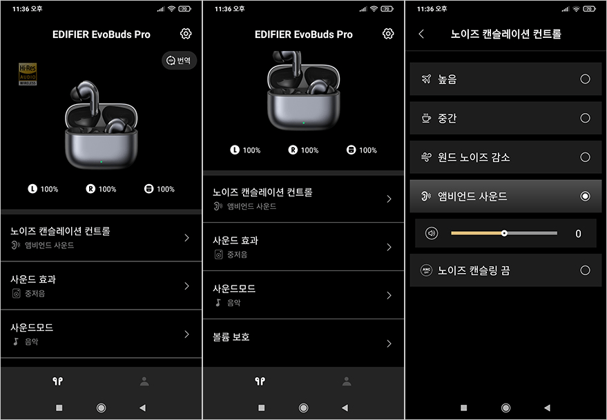 그리고, EvoBuds Pro 역시 에디파이어의 공용앱 ConneX를 지원합니다. 정상적으로 블루투스 연결이 되면, 앱에서 자동으로 장치 인식을 하고, 기능 메뉴들을 다룰 수 있는데, 메인 화면에는 충전케이스와 이어폰 배터리 잔량과 함께 메인 메뉴로 노이즈 캔슬레이션 컨트롤, 사운드효과, 사운드모드, 볼륨 보호를 확인할 수 있습니다. 노이즈 캔슬레이션 컨트롤은 ANC 기능뿐만 아니라 주변 대화의 앰비언드 사운드 조절 기능까지 함께 포함하고 있으며, 사운드효과는 총 5가지 모드, 사운드모드는 음악/게임/공간음향 3가지를 지원해주고 있으며, 볼륨제한은 청각 보호를 위한 기능으로 사용자가 활성화/비활성화 선택할 수 있습니다. 이밖에도 메인화면 우측 상단에 있는 설정메뉴로 들어가면, 제어설정에 이어폰 압력센서 컨트롤 설정을 할 수 있는데, 짧게 2번과 3번, 길게 누르기 3가지 방식으로 좌우 이어폰 설정을 할 수 있습니다. 그리고, 압력강도 조절도 할 수 있죠. 이밖에도 HD 오디오 코덱, 착용감지, 전원 예약설정 기능도 지원하고 있습니다.