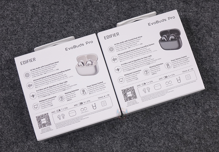 제품패키지는 다른 무선 이어폰 제품들과 마찬가지로 박스형 태이며, EvoBuds Pro는 실버와 그레이 2가지 색상으로 출시했는데, 박스 전면에 쉽게 색상구분이 되도록 색상에 따라 제품 이이폰 이미지를 담고 있습니다. 그리고, 이미지에서 이미 커널형 이어폰이라는 것도 알 수 있죠. 아래 모델명 표기와 함께 옆에는 주요 특징으로 파워풀한 베이스, 향상된 액티브노이즈캔슬링(ANC), 3 마이크, 최대 36시간 사용 언급을 하고 있으며, 박스 아래에 색상 표기도 확인할 수 있는데, EvoBuds Pro 같은 경우 국내시장에도 정식출시했기 때문에 KC인증도 받았습니다. 물론, 국내 정식가격보다 에디파이어의 알리익스프레스 공식스토어가 좀 더 저렴하죠.