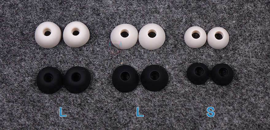 끝으로, 추가 구성품으로 제공되는 이어팁 같은 경우에는 이어폰에 기본 장착된 중간(M) 사이즈를 제외하고 교체할 수 있는 사이즈로 대형(L) 사이즈 2종류와 소형(S) 사이즈 1쌍을 제공해 주는데, 대형 사이즈 같은 경우 높낮이의 경사가 다른 것을 확인할 수 있습니다. 착용 압력을 줄이고 싶으면 경사가 완만한 이어-팁을 사용하면 되죠. 그리고, 기본 제공의 충전케이블은 USB-A to C 인터페이스를 가졌으며, 길이는 30cm입니다.