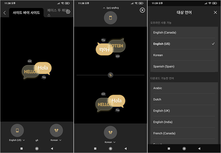 그리고, EvoBuds Pro 무선 이어폰에서 지원하는 색다른 기능이 있는데, 바로 AI 번역기입니다. 메인화면 우측 상단에 있는 번역표기 메뉴를 선택하면, 채팅메시지처럼 표시되는 사이드 바이 사이드와 위아래로 주고받는 표시로 페이스 투 페이스 화면을 선택할 수 있습니다. 그리고, 아래에는 스마트폰으로 듣는 방식과 이어폰을 통해 듣는 방식으로 번역 선택을 할 수 있고, 번역 언어에는 한국어를 포함해 20개국 언어를 지원해주고 있습니다. 참고로 번역 기능은 통화 또는 대화 시 사용할 수 있는 기능이며, 음악재생 번역은 되지 않습니다. 또한, 번역 전에 언어를 선택해서 미리 언어팩 다운로드 과정을 거쳐야 하고, 적당한 발음속도로 대화 및 통화를 해야 번역이 잘 인식되는 편입니다. 또한, 이어폰을 착용한 상태에서 사용해야 좀 더 정확하게 발음을 인식합니다. 이밖에 번역 설정 메뉴로 들어가면 폰트 크기, 음성 시작/종료 대기시간, 스마트폰 또는 이어폰으로 듣기를 전환할 수 있는 장치 역할 전환 메뉴를 확인할 수 있습니다.