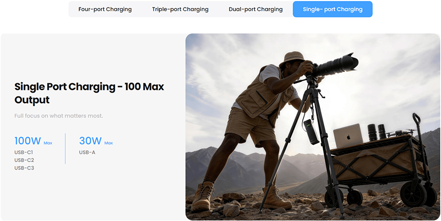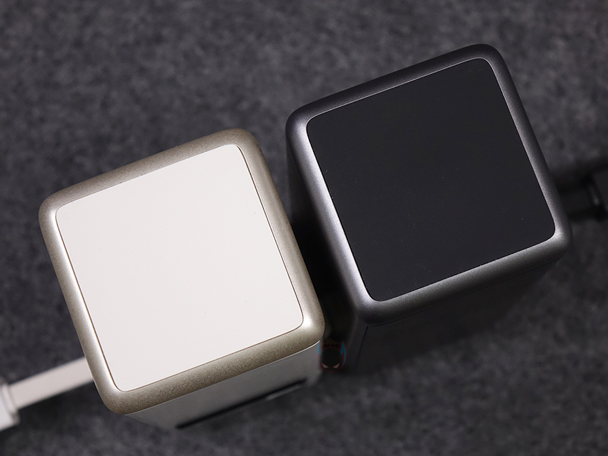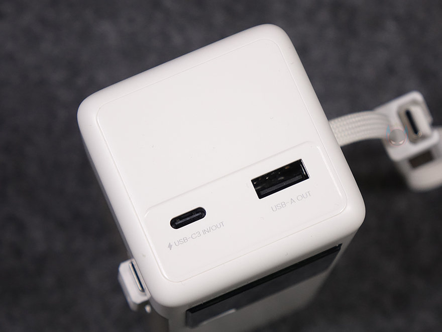 좀 더 자세히 살펴보면, 전면 윗부분에는 작동상태를 확인할 수 있는 스마트 디스플레이(Smart Display)가 배치되어 있습니다. 디스플레이 왼쪽 아래에는 On/Off 버튼도 배치되어 있는데, 제품 색상에 맞춰서 버튼 색상도 통일시켰죠. 그리고, 아래에는 배터리 용량과 총 충전속도 표기를 해놨고, 보조배터리 상단에는 2개의 충전 포트를 확인할 수 있는데, USB-C와 USB-A 포트로 USB-C는 입/출력(In/OutPut) 모두 지원하고, USB-A는 출력만 지원합니다. 참고로, 바로 뒤에서 확인하겠지만, USB-C 인터페이스는 모두 입/출력 최대 100W를 지원하고, USB-A는 출력 최대 30W를 지원합니다.